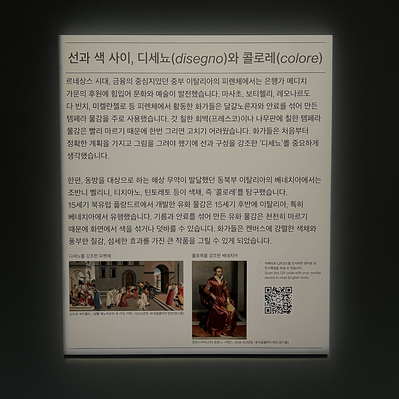 디세뇨disegno는 그림의 '구성'을, 콜로레colore는 그림의 '색'을 의미한다. 이탈리아 중부의 피렌체 사람들은 디세뇨를, 동방 무역이 활발했던 항구 도시 베네치아 사람들은 콜로레를 더 중요한 것으로 판단했다. 전시에서는 피렌체인들이 사용한 템페라는 매우 빨리 마르기 때문에 색을 덧칠할 수가 없어서 자연스럽게 '구성'에 집중하게 되었고, 베네치아인들이 사용한 유화 물감은 느리게 마르기 때문에 색을 여러 번 겹쳐 풍부하게 표현할 수 있어 '색'에 집중하게 되었다고 설명하고 있다. 이것도 맞는 설명이지만, 어떤 현상이 발생하는 데는 여러 원인이 복합적으로 작용하기 마련이다. 그래서 전시를 본 뒤, 재료의 영향뿐만 아니라 각 지역의 사회문화적 배경을 함께 찾아보았다.