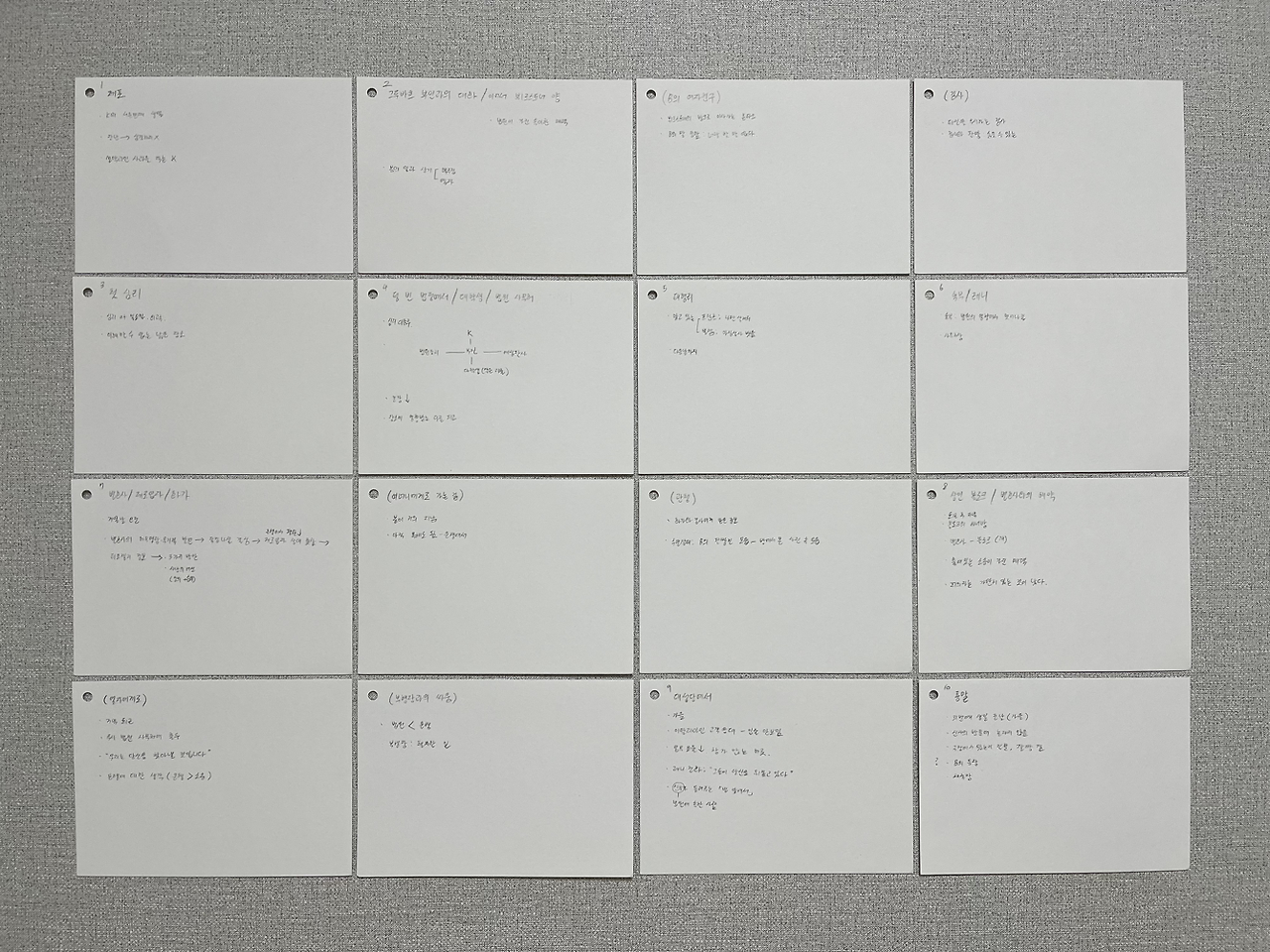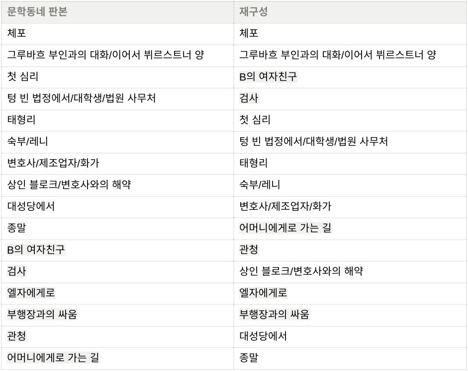 「소송」에서 완성된 장들에 묘사된 계절과 등장인물, 사건들의 흔적에 따라 미완성 장들이 들어갈 순서를 아래와 같이 재구성해 보았다. 미완성 장을 읽지 않는다고 해서 이야기를 이해하는 데 큰 영향은 없지만, 완성된 장에 짧게 언급하고 지나간 내용들이 자세히 묘사됨으로써 K라는 인물이 좀 더 촘촘하게 그려지는 느낌이었다. 또한, 이야기들을 서로 끼워맞추며 읽게 되는 형식적인 측면에서 현실과 비현실을 넘나드는 카프카만의 기묘한 방식이 느껴져서 이 책이 미완성으로 남은 것이 오히려 카프카스러움을 더욱 강조해주었다는 생각이 들었다. 내용으로나 형식으로나 결코 완전히 파악할 수 없는 미로같은 소설이었다.