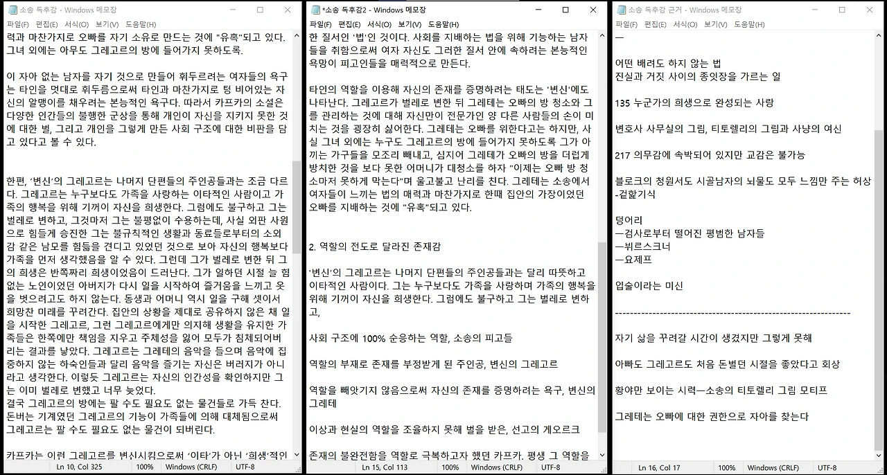 하지만 겉보기에 내면이 단단해 보이는 「소송」의 여자들은 자신을 지켜주는 남자들에게서 독립할 수 없고, 유일하게 오빠의 변신을 포용하는 것처럼 보였던 그레테는 오빠 때문에 하숙인들이 나가자 자비없이 그를 내친다. 이처럼 존재의 중심을 외부에 두는 이들은 근본적으로 자신을 흔드는 사회 질서에 다가가려는 의지조차 없다는 점에서 「소송」의 피고들보다도 더 무의미한 행동을 반복하는 것처럼 보인다.