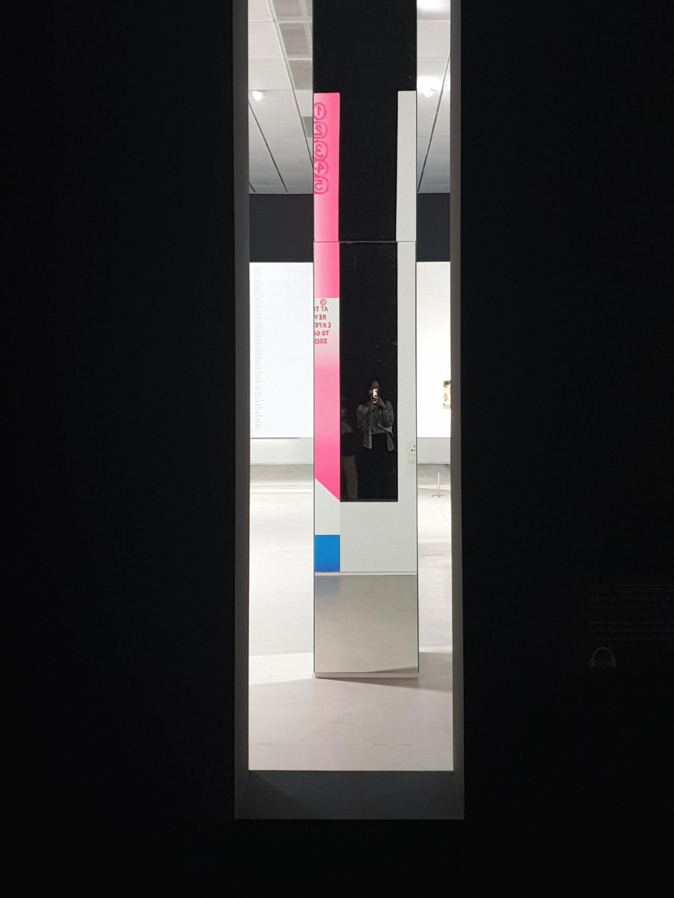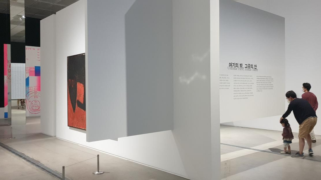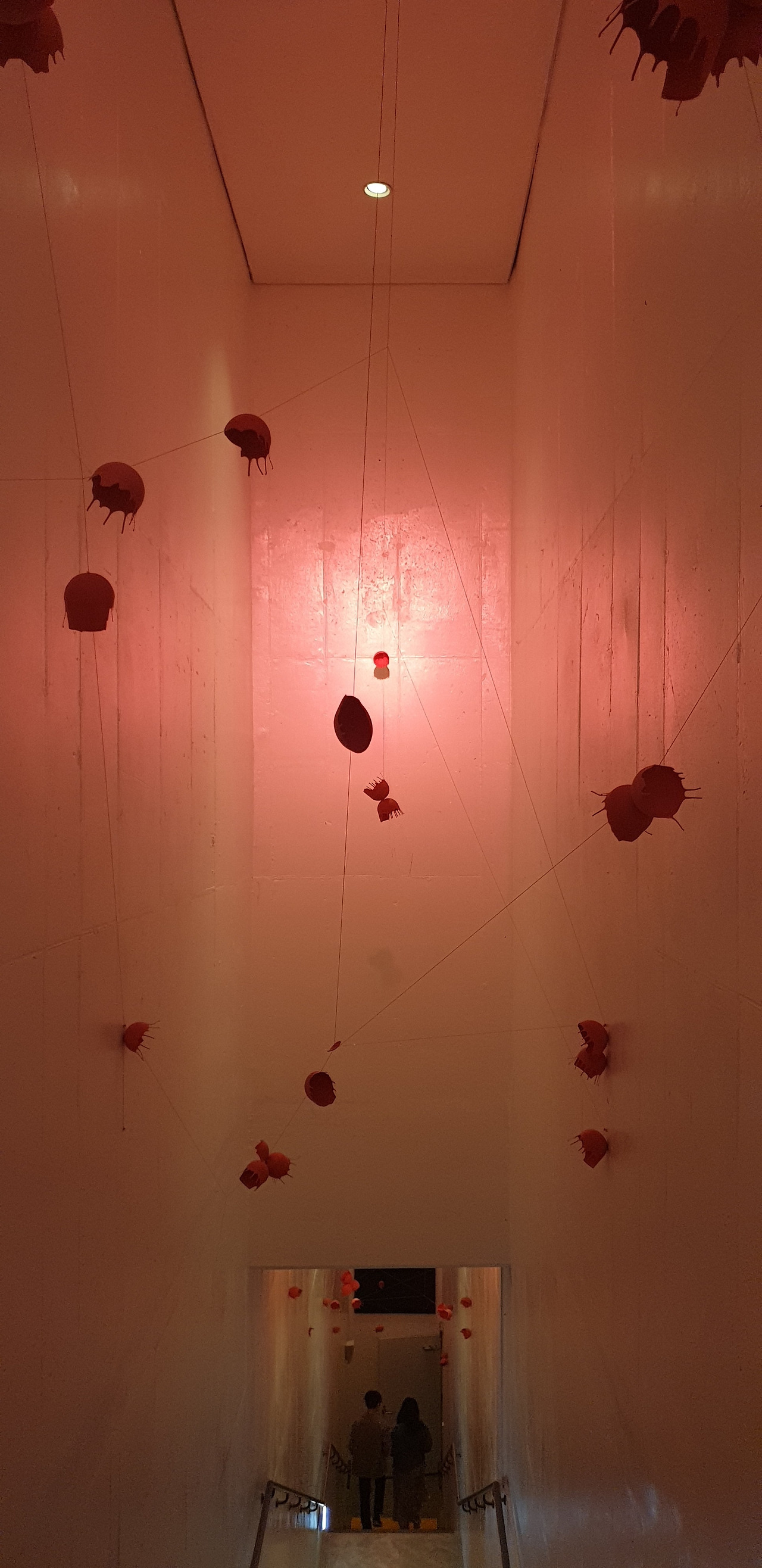 아래층으로 내려가는 계단 '3. 숫자와 거리'는 '4. 여기의 밖, 그곳의 안'과 같은 공간에 설치되어 있어 두 챕터 사이의 구분이 명확하지 않다. 2, 3, 4 섹션 모두 거리에 대한 주제이지만 2가 '연결'이라는 주제에 더 가깝다면 3, 4는 정말로 '물리적 거리'에 관한 내용이기에 두 챕터는 상당히 연관성이 있다. 그래서 이 공간은 거대한 벽들이 서로 겹쳐 있고 그 사이를 들락날락하면서 두 챕터의 작품을 관람하게 된다. 이때, 벽의 서로 겹치고 가까워지는 부분들을 통해 다른 공간까지 넘어다볼 수 있게 해서 우리가 현재 겪고 있는 다양하고도 복잡한 거리를 직접 경험할 수 있었다.