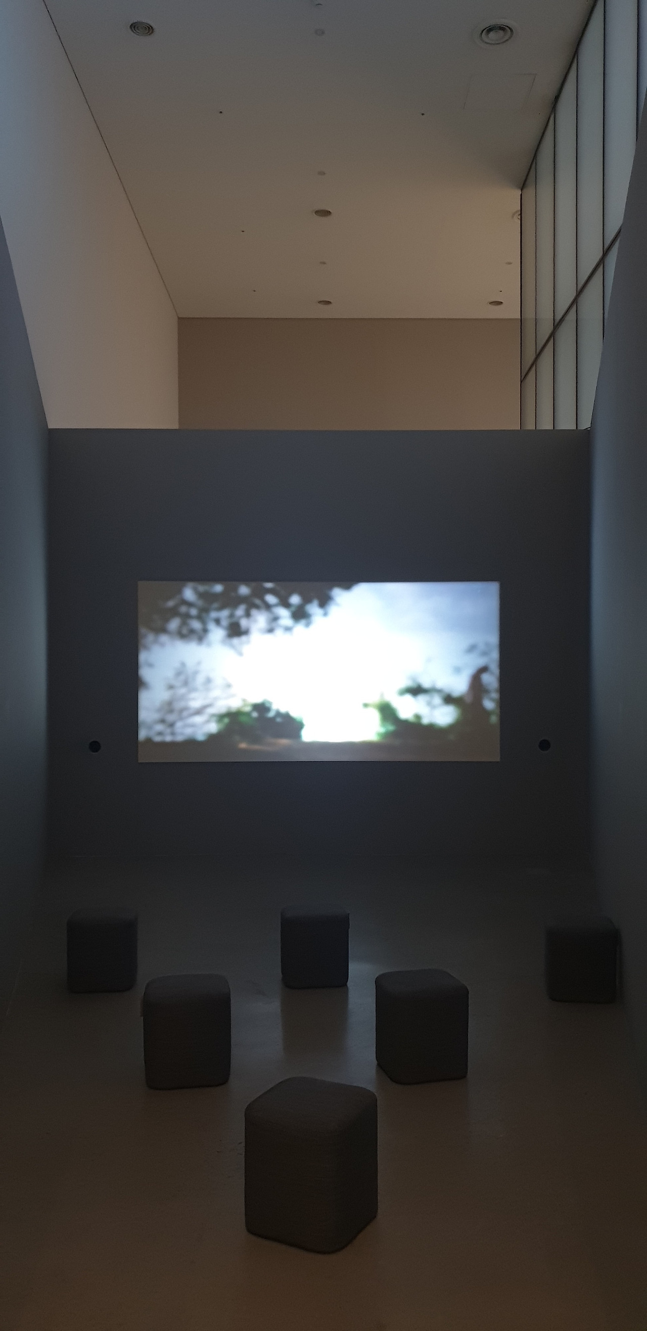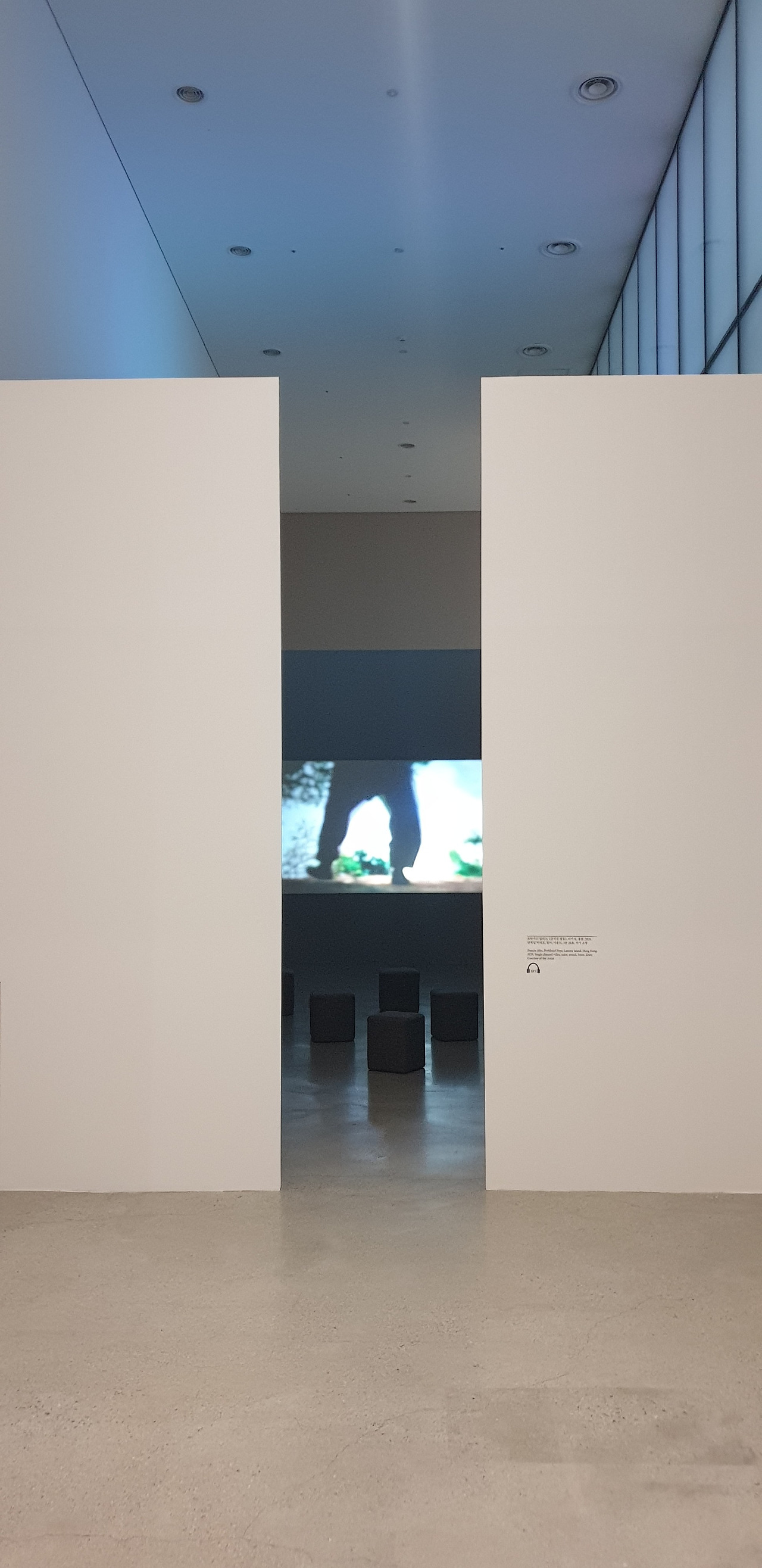 감싸고 감싸지는 두 작품 '2. 집콕, 홀로 같이 살기'는 아래층에서 감상할 수 있는데, 내려가는 계단의 높은 층고에 불안감이 느껴지는 형상의 작품을 설치해 사회의 분위기를 잘 보여준다. 이후에는 다시 원래 층으로 올라와서 건너편에 있는 전시실로 이동하게 된다. 챕터 3 바로 앞에 있는 '금지된 걸음'이라는 영상은 가운데 입구는 좁고 스크린과 가까워질수록 폭이 넓어져서, 처음에는 영상의 가운데 부분만 보이던 작품이 가까이 걸어갈수록 서서히 드러난다. 전시장 외부에 있어 자칫 눈에 띄지 않을 수 있는 작품을 벽을 활용해 강조하면서도 외부로부터의 소음을 최대한 차단하는, 그러면서도 작품에 가까이 걸어가며 서서히 드러나는 영상을 통해 제목인 '금지된 걸음'을 직접 느낄 수 있는 일석삼조의 해결방안이었다.