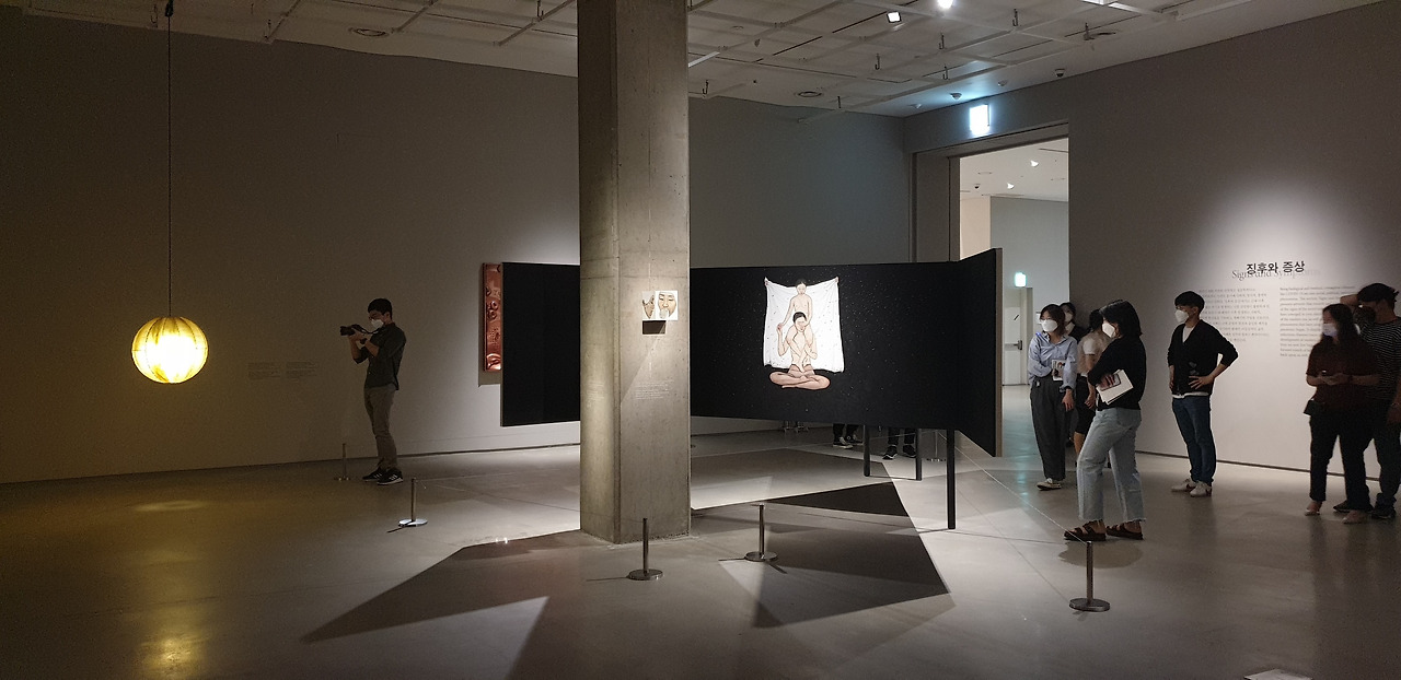국립현대미술관 서울관에서 팬데믹에 관한 전시가 열리고 있다. 전시는 팬데믹 상황을 기록하는 것부터 시작해 우리의 새로운 일상들을 보여주고, 이 상황을 초래한 우리의 지난 행적들을 되돌아보는 순으로 마무리한다. 제목의 ‘치유’라는 단어는 우리를 위한 정신적인 위로를 뜻하기도 하지만 우리가 그동안 자연에 가한 위협에의 치유를 뜻하기도 한다. 그래서인지 전시디자인에서도 물리적인 가공을 최소화한 점이 눈에 띄었다. 각 작품에 대한 해설은 리플렛에 상세히 나와 있어서 나는 전시 공간과 관련된 작품에 집중해보았다.