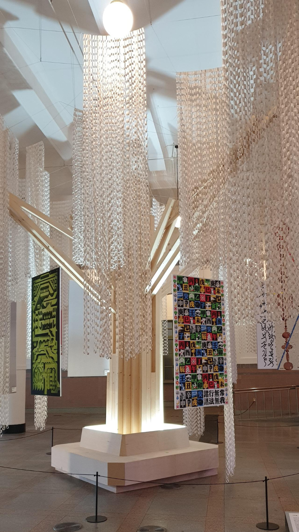 층고가 높은 전시실 중심에 나무를 두고, 작품을 나무에 부적처럼 걸어놓은 장면이 인상적이었다. 동양의 사찰이나 사원에는 오래된 나무가 있어 사람들이 이 나무를 모시고 소원을 빈다. 작가 개인의 소망을 담고 있는 작품들은 하나의 부적이 되어 이 신성한 나무에 걸려 있다. 함께 전시를 본 친구는 나무의 잎사귀 역할을 하는 종이 고리들과 작품이 부착된 폴리카보네이트 모두 반복이라는 공통점이 있어 보인다고 말했는데 그 말에 무척 공감했고, 더불어 반복적인 패턴이 무언가를 염원할 때 끊임없이 기도하는 행위와도 연결되어서 재료와 제작 방식이 주제와 잘 어울린다는 생각이 들었다.