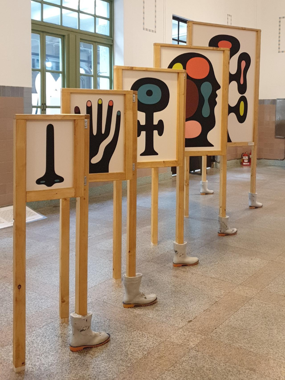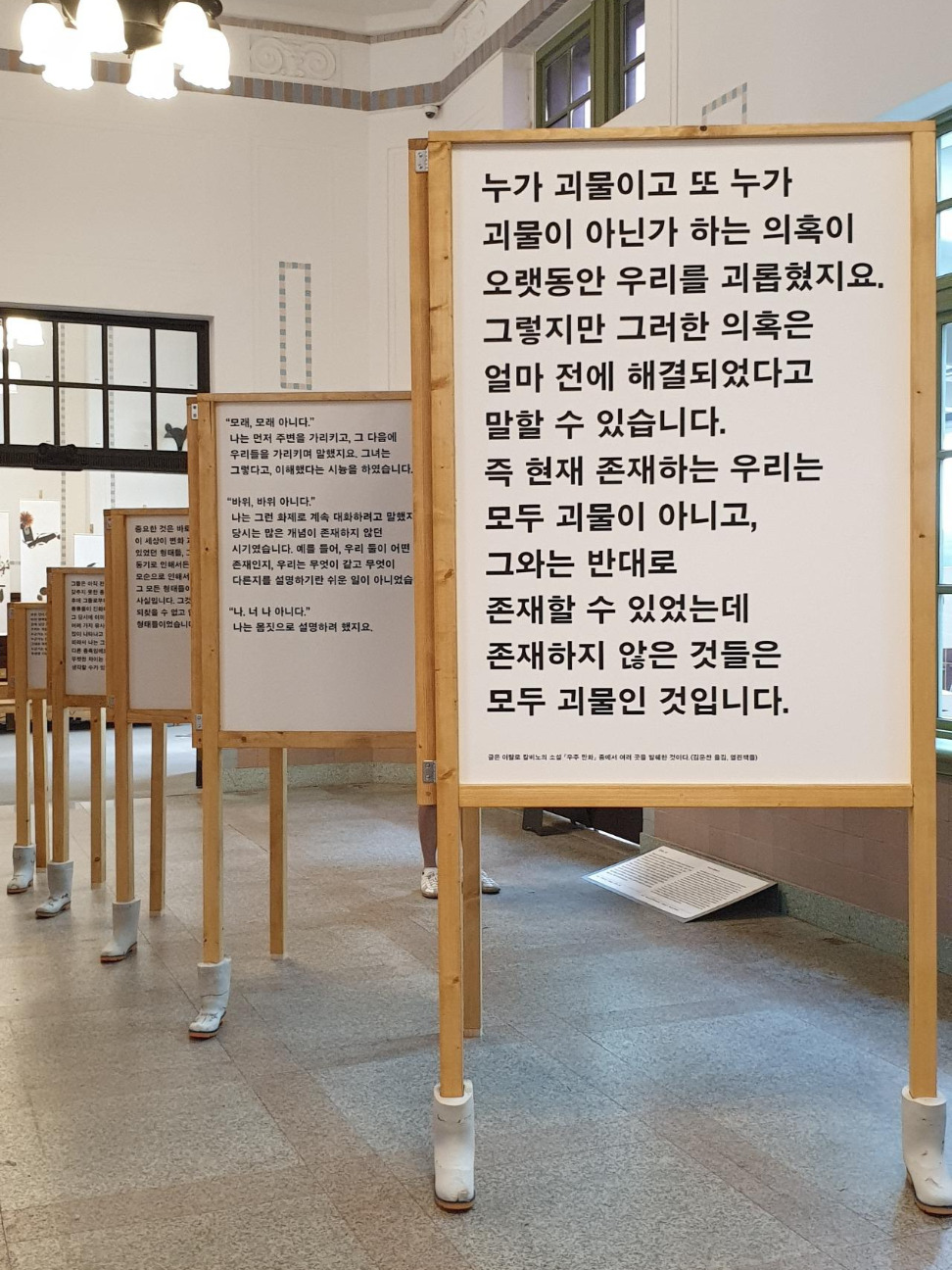 현재의 생명에 관한 작품이 있는 파트 2에서는 차별금지법 관련 작품이 가장 인상적이었다. 작품은 병풍처럼 지그재그로 생긴 파티션에 한 면에는 글, 반대 면에는 글에 관한 그림이 프린팅 되어 있다. 하나의 주제에 관한 글과 그림을 각도에 따라 글만 볼 수도 있고 그림만 볼 수도 있어서 이야기를 다양한 방법으로 감상할 수 있었다. 특히 파티션 발에는 신발이 신겨져 있는데, 무언가 투쟁적인 의미를 담은 것이 아닐까 유추해보았으나 전시디자인을 맡은 스튜디오 맙소사(marcsosa)에 따르면 관람자가 동선을 헷갈릴까 봐 관람 동선을 신발 방향으로 표시해둔 것이라고 한다. 일반적으로 동선 표시라고 하면 잘 정리된 그래픽으로 친절하게 알려주는 방식만을 떠올리곤 하는데, 이러한 편견을 깬 신선한 방식이었다.