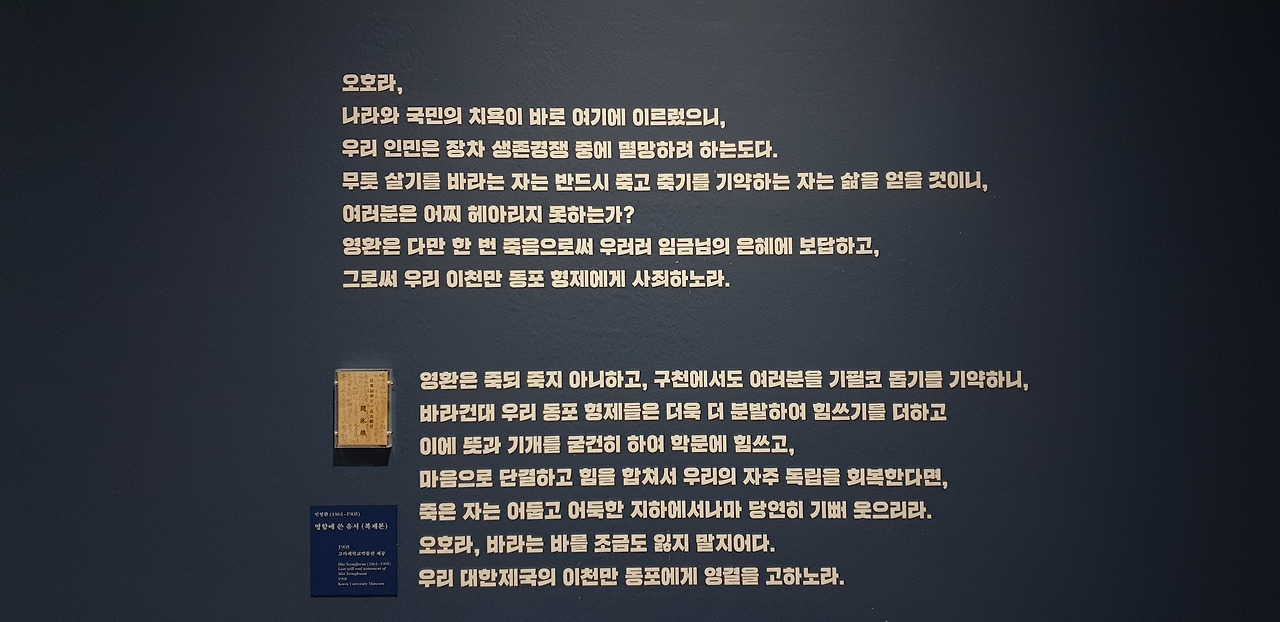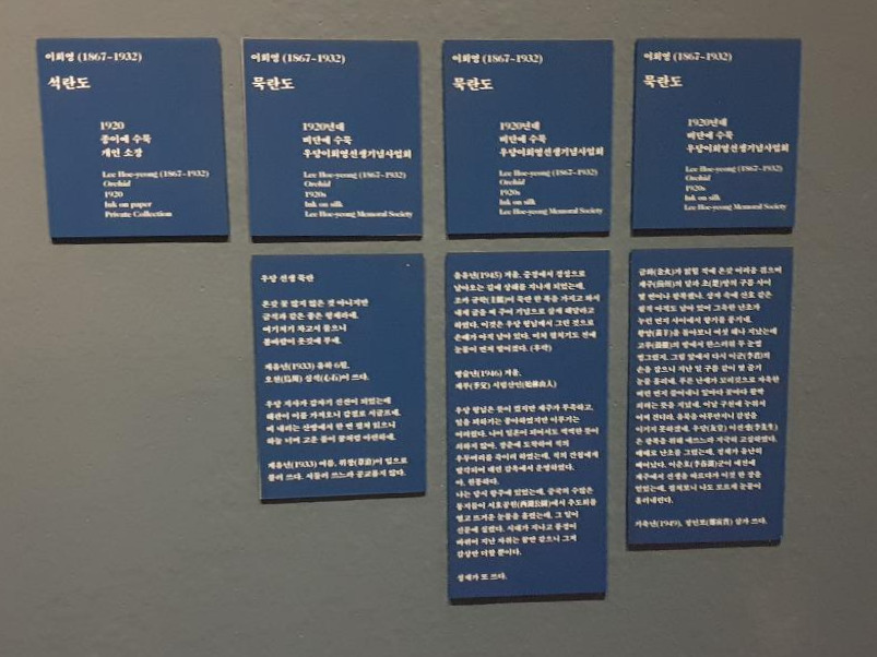 1 전시실 ‘의로운 이들의 기록’에서는 위정척사파의 초상과 그들의 지조를 나타내는 사군자 작품이 전시되었다. 동양화의 특성상 대부분의 작품에 '제발'이라 불리는 한문 글 이 적혀있었는데, 작품의 기본 정보가 담긴 캡션 아래에 제발을 뜻풀이한 캡션이 추가로 있었다. 그러나 가만히 서서 고개 숙여 읽기에는 다소 긴 분량이었고, 무엇보다도 한글로만 적혀있었다. 덕수궁관에는 위치 특성상 외국인 관광객들이 많이 방문하곤 하는데, 한글을 읽을 수 없는 그들 입장에서는 작품에 관해 얻을 수 있는 정보가 제목 캡션뿐이었을 것이다. 문인 사상을 바탕으로 발전해온 조선의 미술에서 글을 이해하지 못하면 작품을 진정으로 감상한다고 할 수 없기에, 이 점을 배려하지 않은 점이 무척 아쉽다. 캡션보다는 뜻풀이용 리플렛을 제작해 관객이 가지고 다니면서 읽을 수 있도록 했다면 앞선 문제들을 모두 해결할 수 있었을 것이다.