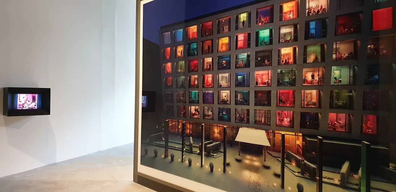 바로 옆의 '다치기 쉬운' 섹션에서는 한 호텔 건물의 단면 사진에 각 방 손님들의 사생활이 그대로 보이는 cctv 같은 사진작품이 있었다. 그리고 사진 옆에는 각 방을 크게 확대해서 진짜 cctv 화면으로 훔쳐보는 것 같은 경험을 할 수 있다. 이 디스플레이 방식 덕분에 작품의 주제가 더 크게 와닿았다. 이 섹션에서는 우리가 사는 공간과 관련된 작품들이 많았는데, 같은 아파트에 사는 제각기 다르지만 비슷한 가족 유형들을 사진 찍은 작품은 전시장 내부에 벽이 움푹 들어간 곳에 전시되어서, 네모난 아파트 건물 내부에 사는 사람들을 보는 듯 한 느낌이 들었다. 사진들을 일렬로 배치하지 않고 무작위로 배치한 것도 그런 느낌을 주는데 한몫했다.