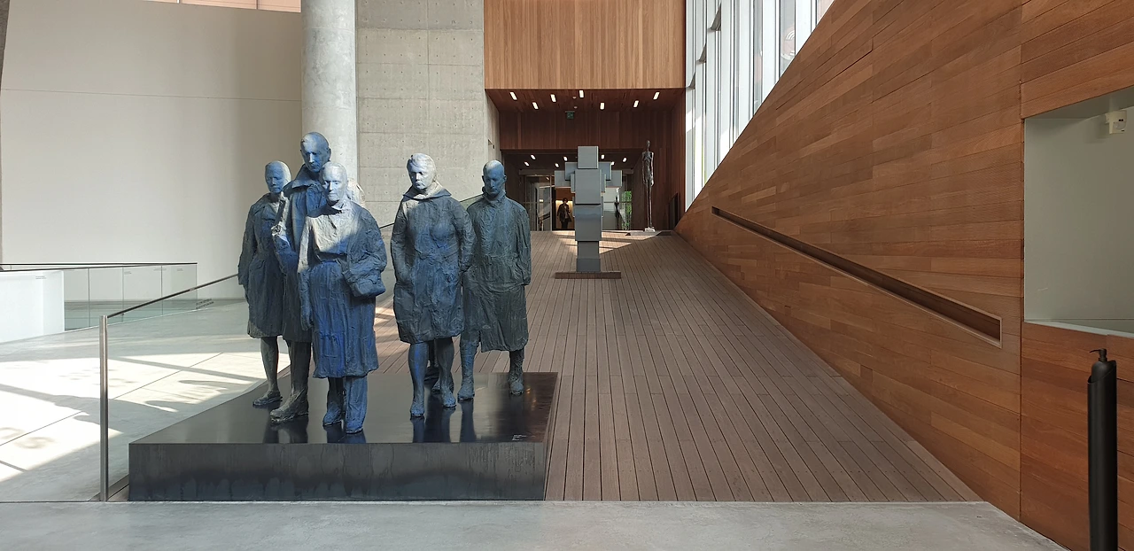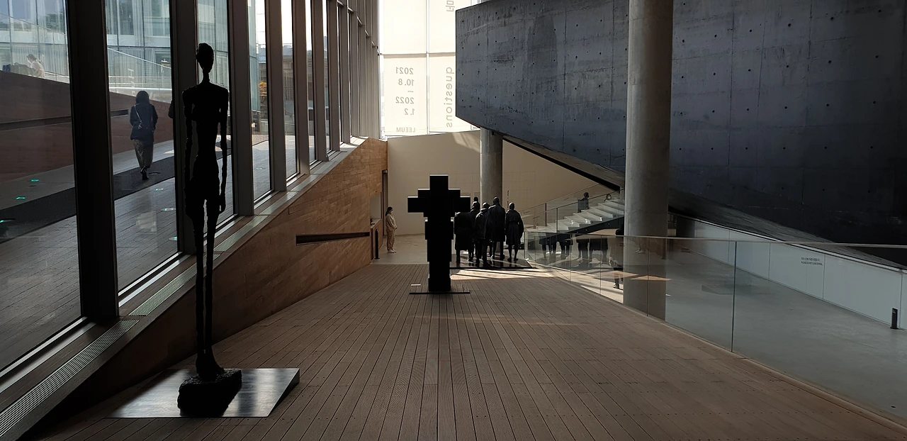 전시장은 이곳에서 끝나지만, 전시를 보고 나오면서 전시장에 처음 들어갈 때 지나쳤던 작품들을 다시 보게 된다. 아동교육문화센터는 처음에 슬로프를 따라 내려간 후 티켓을 확인하고 전시장에 입장하게 된다. 그런데 인간의 모습을 표현한 3개의 설치 조각 역시 관객이 걸어가는 방향과 같은 방향으로 놓여 있어서 관객 입장에서는 처음에 작품의 뒷면을 보게 되고, 대부분 의아해하며 일단 전시를 보러 간다. 그런데 전시를 보고 아동교육문화센터 바깥으로 나올 때 이 배치의 진면목이 드러난다. 처음과 반대로 슬로프를 올라가면서 세 작품의 앞모습을 보게 되는데, 이 작품들은 모두 인간의 모습을 다룬 것으로, 차례로 조지 시걸, 안토니 곰리, 알베르토 자코메티의 작품이 놓여있다. 앞에서 뒤로 갈수록 추상화된 인간의 모습을 보고 그 사이를 걸어가면서 우리는 인간의 정체성에 대해 고민해보는 이번 전시 주제를 다시금 되새길 수 있다.