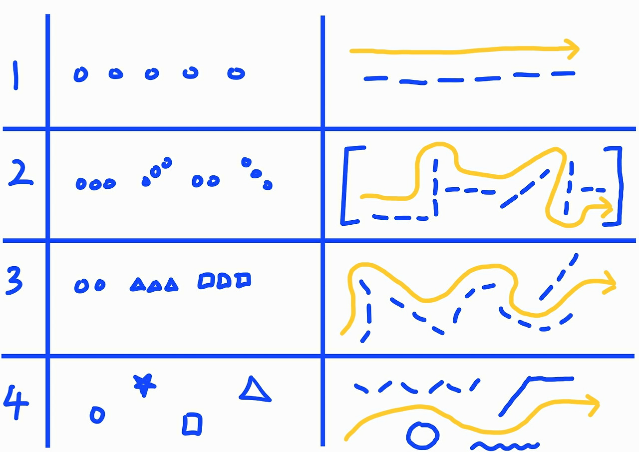 위 그림은 필자가 작품 흐름의 패턴을 분석하고 그에 어울리는 동선을 구상해본 것이다. 먼저 비슷한 내용의 작품들이 반복되는 섹션 1은 직선 동선을 가진다. 섹션 2는 예루살렘에 방문한 샤갈이 영감을 받아 성서 연작을 그리기 시작했다는 배경 소개가 있고 그다음 작품이 나오는 액자식 구성을 가졌다. 그래서 섹션 앞뒤로 배경 소개의 이야기를 놓고 중간에 다양한 동선으로 성서 연작을 배치했다. 성서의 여러 이야기를 차용해 자신의 메시지를 그림에 담은 섹션 3은 액자식 구성 없이 섹션 2보다 더 과감한 동선을 가진다. 마지막으로 다양한 매체의 작품이 등장하는 섹션 4는 매체의 다양성 자체가 재미를 주기에 동선의 개입을 최소화해 작품 자체에 집중했다. 이렇게 작품을 벽에만 걸지 않고 공간을 다양하게 사용했다면 전시의 경험적인 측면에서도 더 나은 경험이 되었을 것이라 생각한다.