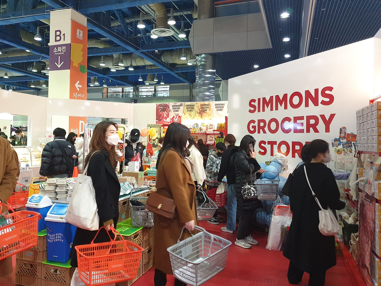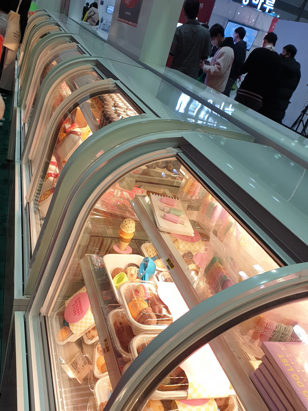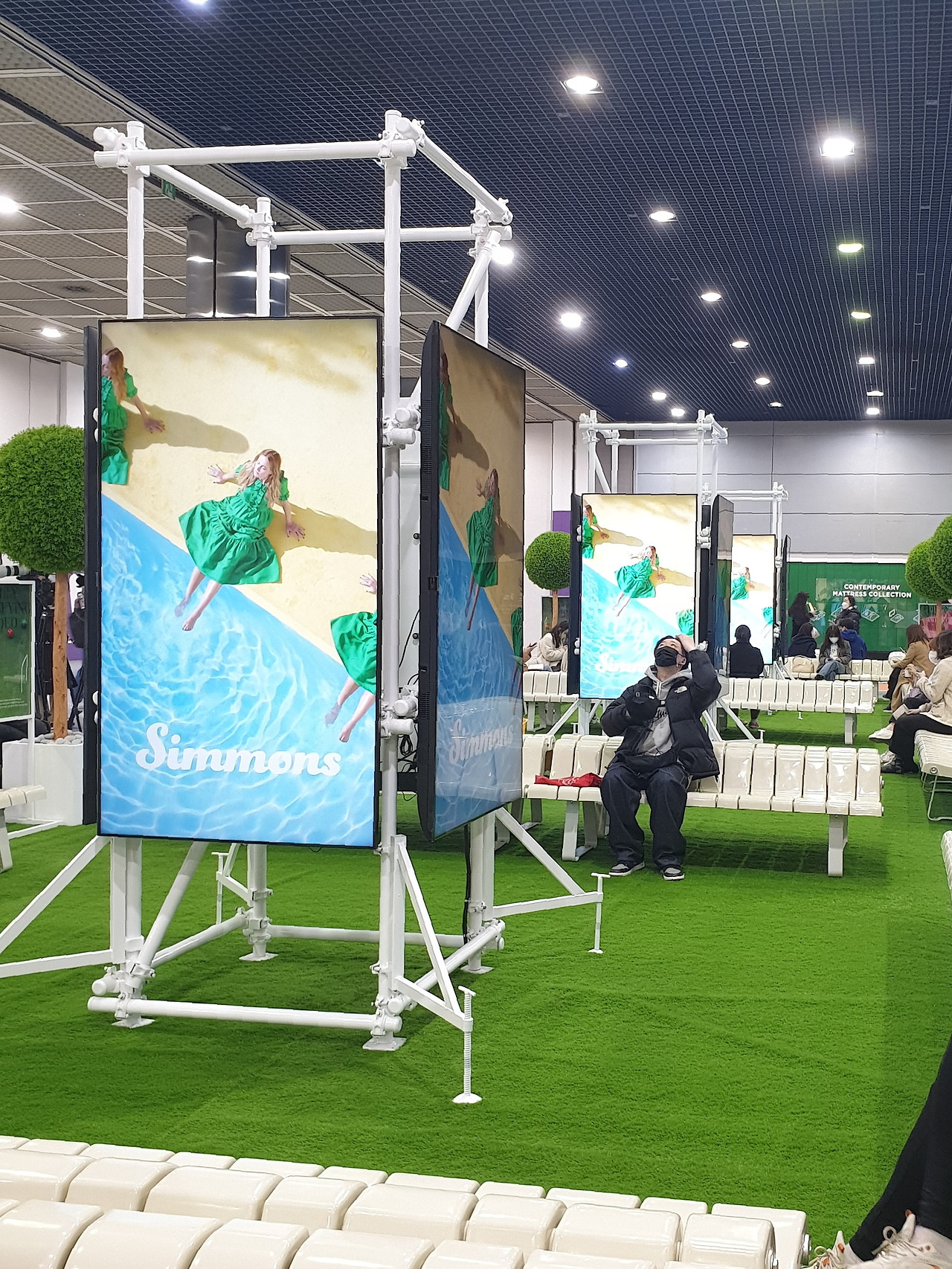 (왼) 레어로우, (중, 우) 과감한 디자인의 가구들 두 흐름은 전자의 경우 주거공간의 현재를, 후자의 경우 근미래를 보여주는 듯하다. 그리고 이 주류의 경향을 뒷받침하는 주제의 부스들도 있었다. 먼저 ar을 통해 인테리어를 시뮬레이션하는 서비스인 어반베이스는 가구를 파는 브랜드에서 운영하는 것이 아니라 그런 브랜드들과 제휴해 시뮬레이션만 전문으로 하는 독자적인 플랫폼인데, 이런 점이 가상현실의 일상화를 보여주는 지점이다. 또한 예술작품을 저렴하게, 편하게 구입할 수 있도록 작가와 구매자를 연결하는 갤러리들도 많이 보였는데, 이렇게 예술을 일상적으로 향유하는 흐름 역시 가상현실적 이미지가 일상적으로 소비되는데 한몫하는 것 같다. 마지막으로 두 경향을 모두 아우르는 부스가 하나 있는데, 바로 최근 들어 힙한 플래그십 스토어로 인기가 많은 시몬스다. 멍 때리기를 주제로 한 평화로운 정원 느낌의 라운지 뒤에 이질적인 소품들의 믹스매치로 구성한 그로서리 스토어 컨셉의 부스는 쌀을 우유팩에 담는다든지, 생활용품을 정육점 냉장고 안에 전시하는 식의 이질적인 연출로 올해 페어에서 가장 인기가 높았다. 올해 주거 디자인의 큰 흐름을 모두 표현한 것을 보면서 인기에는 이유가 있구나 싶었다.