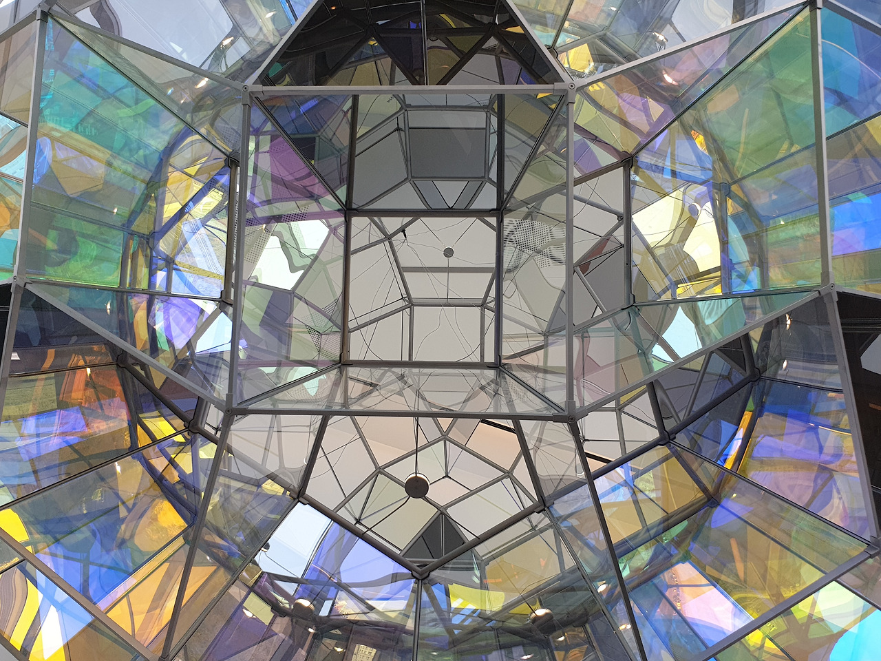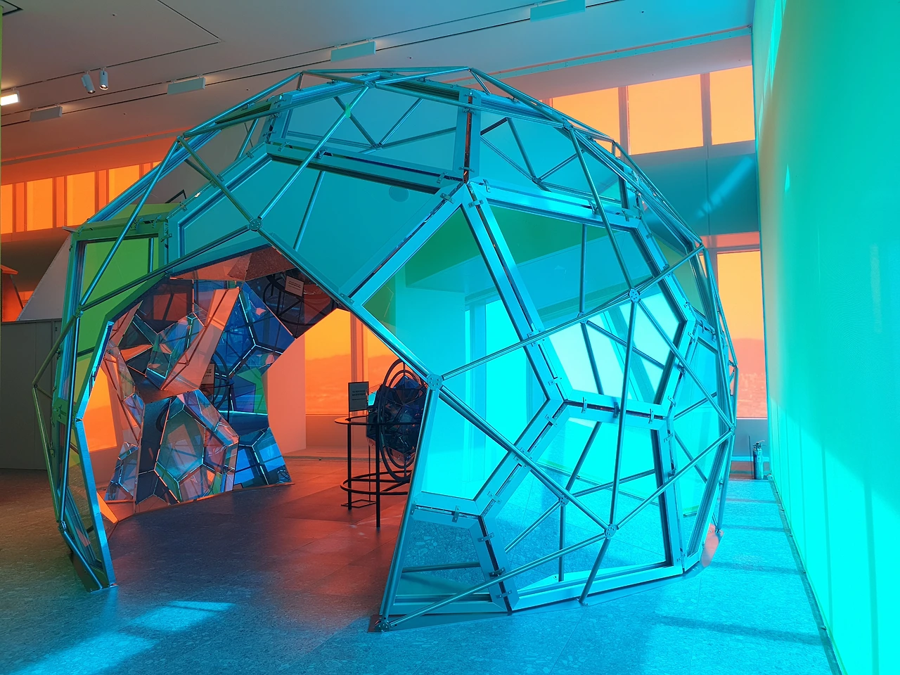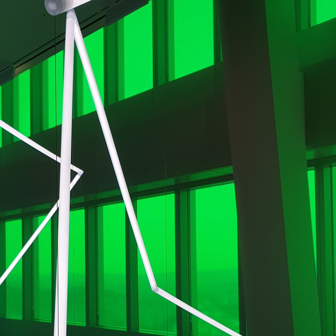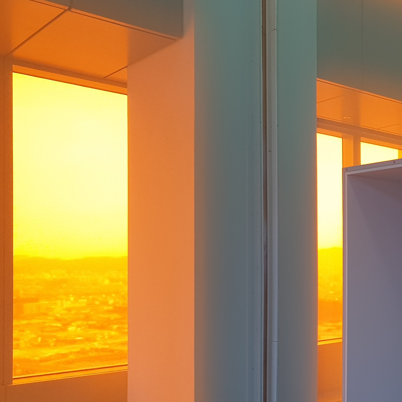 42층으로 올라가면 가장 먼저 눈에 띄는 것은 창문을 뚫고 들어오는 강렬한 색감의 빛이다. 사각형의 전망대는 4개의 면으로 구성되어 있는데, 네 면은 각각 빛의 혼합의 기본색인 Red, Green, Blue, 그리고 이 색들이 모두 합쳐졌을 때 나오는 White의 4가지 색으로 구성된다. 사실 공식적인 설명에서는 색의 혼합의 기본색인 Cyan, Magenta, Yellow, blacK으로 구성된다고 나와있는데, 개인적으로는 창문 색이 아무리 봐도 CMYK보다는 RGB에 더 가깝고 올라퍼 엘리아슨의 작품 역시 빛을 연구하는 작업이다 보니 그의 작업에는 빛의 혼합이 더 어울린다고 생각한다. 창문의 색이 빛의 혼합인지 색의 혼합인지에 따라서 작품을 이해하는데 큰 차이가 생기지는 않아서 좀 더 자율적으로 전시를 보았다.