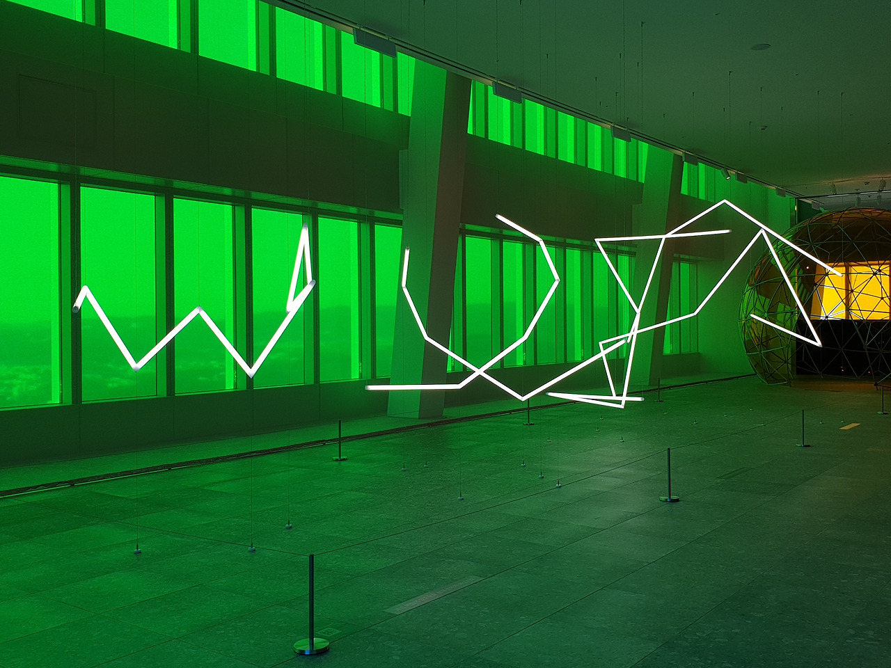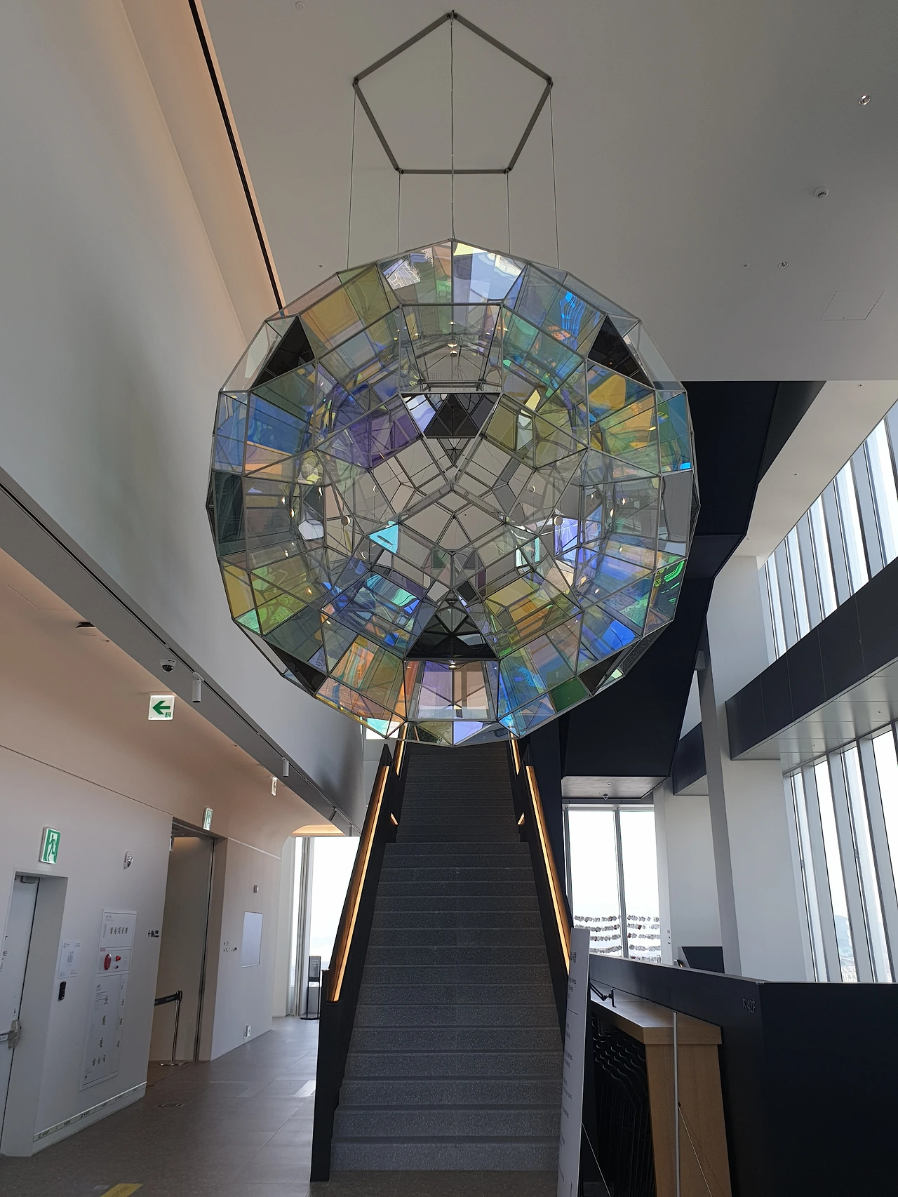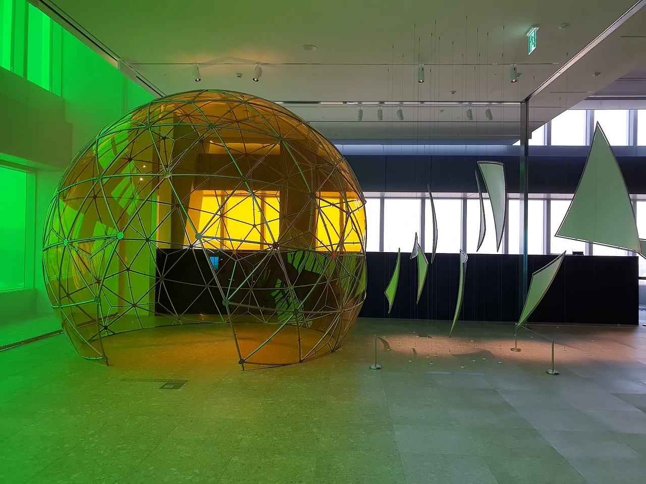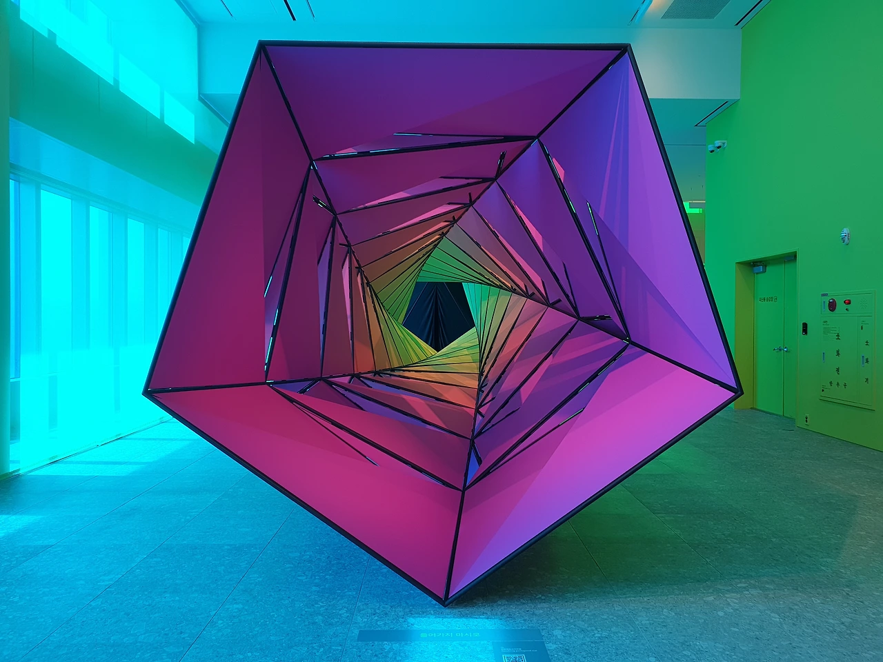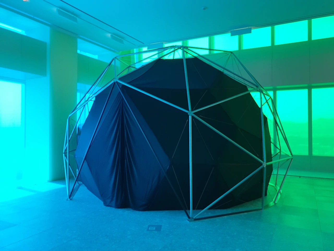 42층으로 올라가면 가장 먼저 눈에 띄는 것은 창문을 뚫고 들어오는 강렬한 색감의 빛이다. 사각형의 전망대는 4개의 면으로 구성되어 있는데, 네 면은 각각 빛의 혼합의 기본색인 Red, Green, Blue, 그리고 이 색들이 모두 합쳐졌을 때 나오는 White의 4가지 색으로 구성된다. 사실 공식적인 설명에서는 색의 혼합의 기본색인 Cyan, Magenta, Yellow, blacK으로 구성된다고 나와있는데, 개인적으로는 창문 색이 아무리 봐도 CMYK보다는 RGB에 더 가깝고 올라퍼 엘리아슨의 작품 역시 빛을 연구하는 작업이다 보니 그의 작업에는 빛의 혼합이 더 어울린다고 생각한다. 창문의 색이 빛의 혼합인지 색의 혼합인지에 따라서 작품을 이해하는데 큰 차이가 생기지는 않아서 좀 더 자율적으로 전시를 보았다.