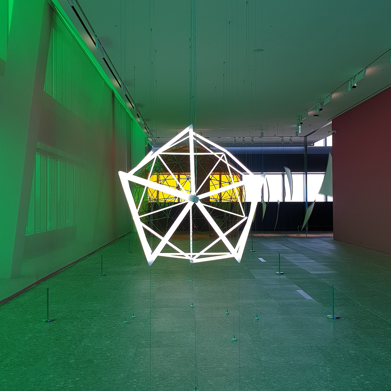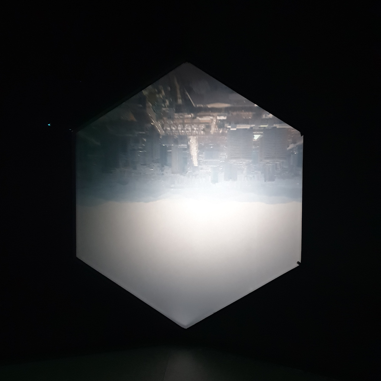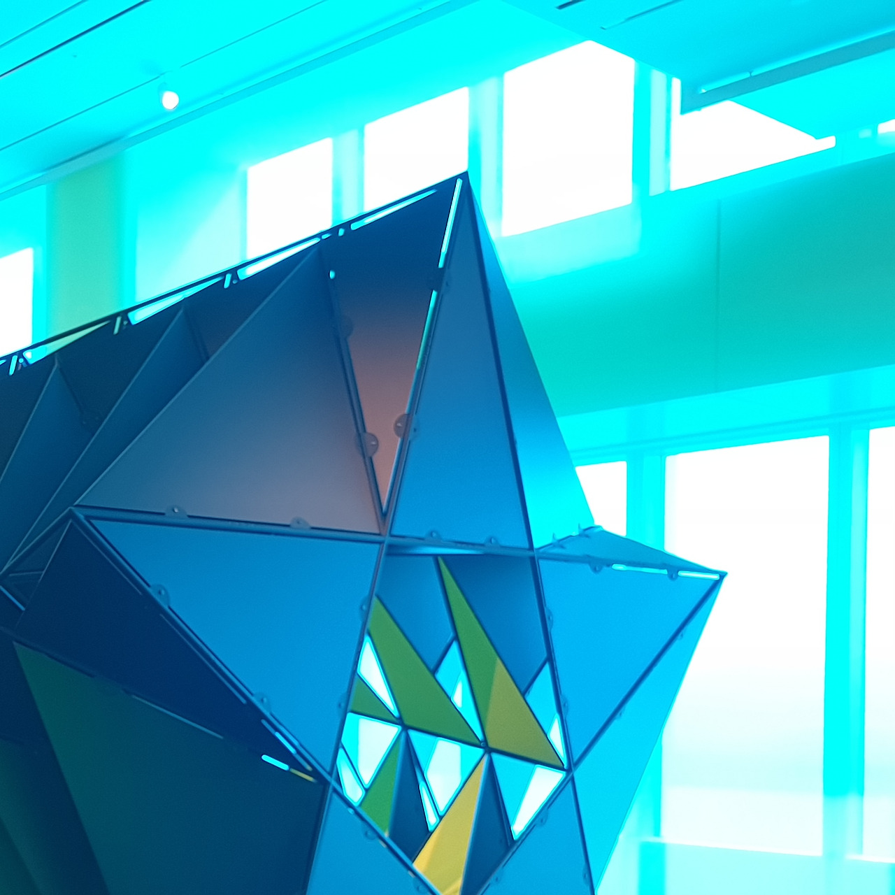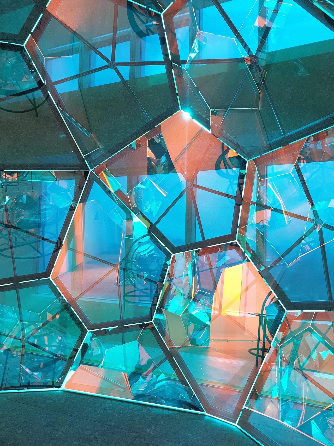 42층으로 올라가면 가장 먼저 눈에 띄는 것은 창문을 뚫고 들어오는 강렬한 색감의 빛이다. 사각형의 전망대는 4개의 면으로 구성되어 있는데, 네 면은 각각 빛의 혼합의 기본색인 Red, Green, Blue, 그리고 이 색들이 모두 합쳐졌을 때 나오는 White의 4가지 색으로 구성된다. 사실 공식적인 설명에서는 색의 혼합의 기본색인 Cyan, Magenta, Yellow, blacK으로 구성된다고 나와있는데, 개인적으로는 창문 색이 아무리 봐도 CMYK보다는 RGB에 더 가깝고 올라퍼 엘리아슨의 작품 역시 빛을 연구하는 작업이다 보니 그의 작업에는 빛의 혼합이 더 어울린다고 생각한다. 창문의 색이 빛의 혼합인지 색의 혼합인지에 따라서 작품을 이해하는데 큰 차이가 생기지는 않아서 좀 더 자율적으로 전시를 보았다.