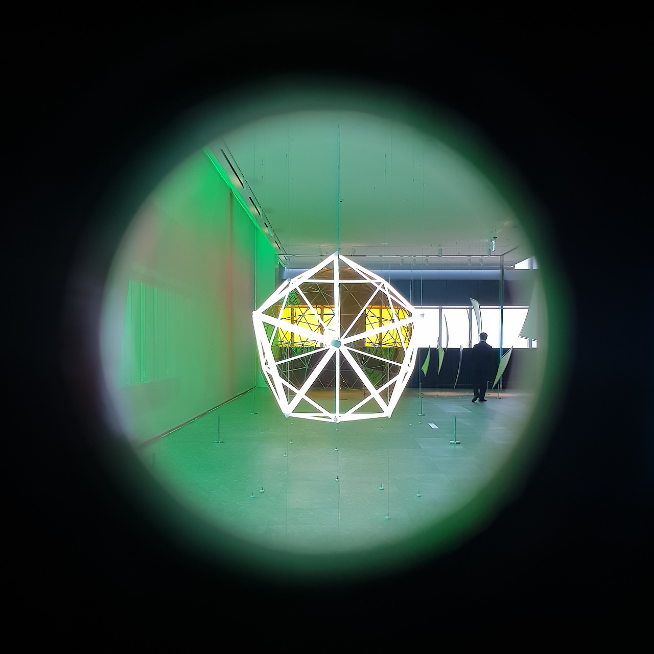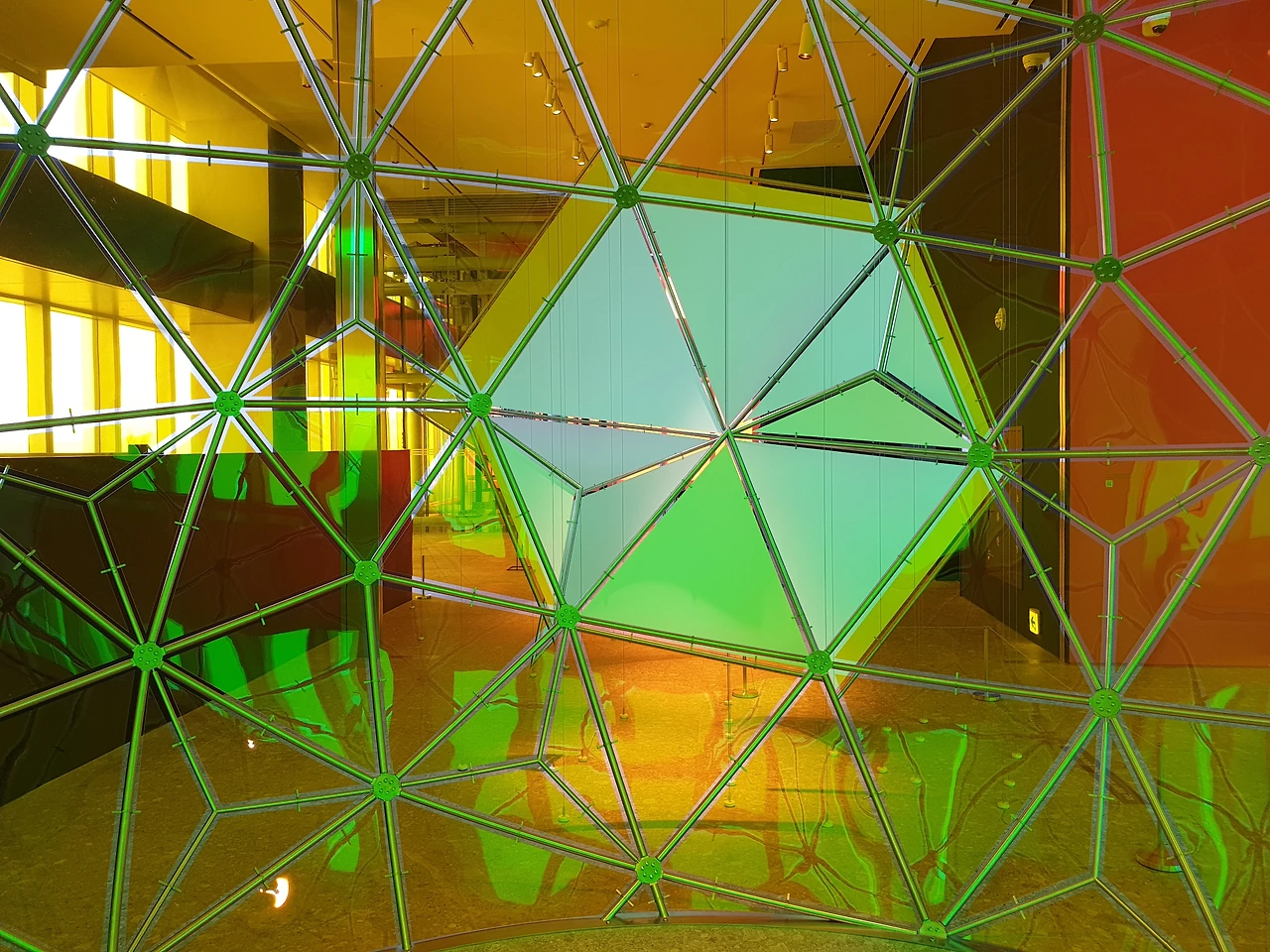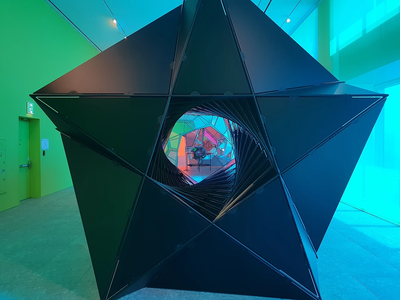 색에 대한 의문을 이쯤에서 정리하고 본격적으로 작품을 감상해보면, 먼저 '1. 아침의 통로'는 Red(또는 Magenta)에 해당하는 붉은빛을 통해 풍경을 감상하는 작품이다. 터널 안쪽의 벽과 천장에 뚫린 삼각형의 구멍을 통해 바깥세상을 보면 기이한 SF 세계 같은 느낌이 든다. 특히 삼각형의 구멍들은 모두 다른 구, 별 형태의 만화경으로 되어 있어서 우주의 각기 다른 행성을 보는 것 같다. 낮에는 빛이 있어서 창문의 붉은색과 함께 시내 풍경을 볼 수 있지만, 태양이 없는 밤에는 시내의 빛만이 왜곡되어 보일 테니 야경을 본다기보다는 은하수를 보는 것 같은 느낌이 들 것만 같다.