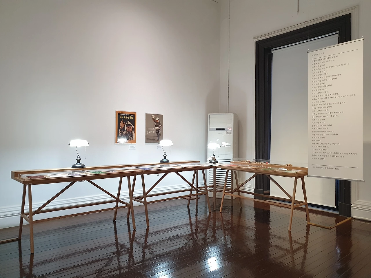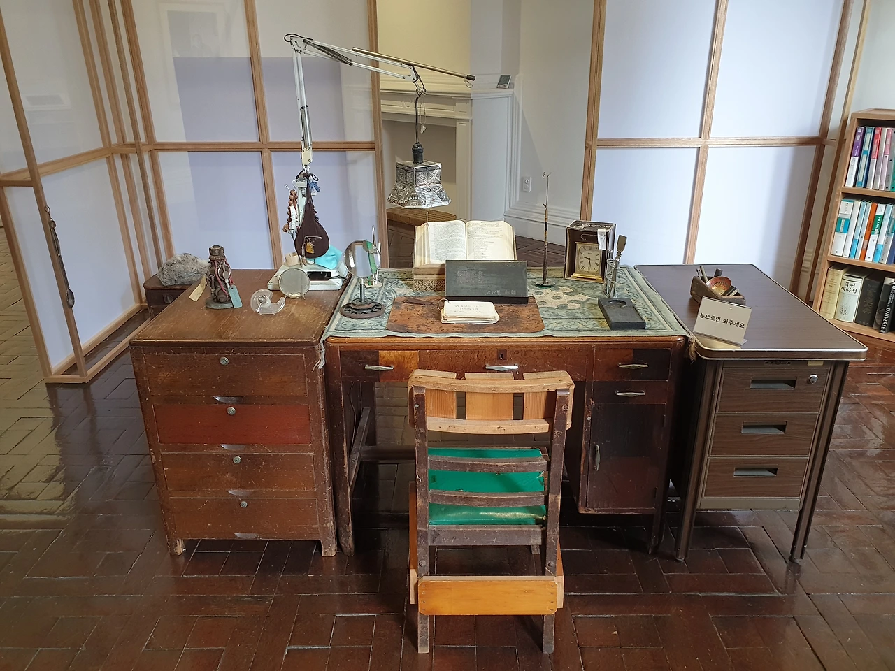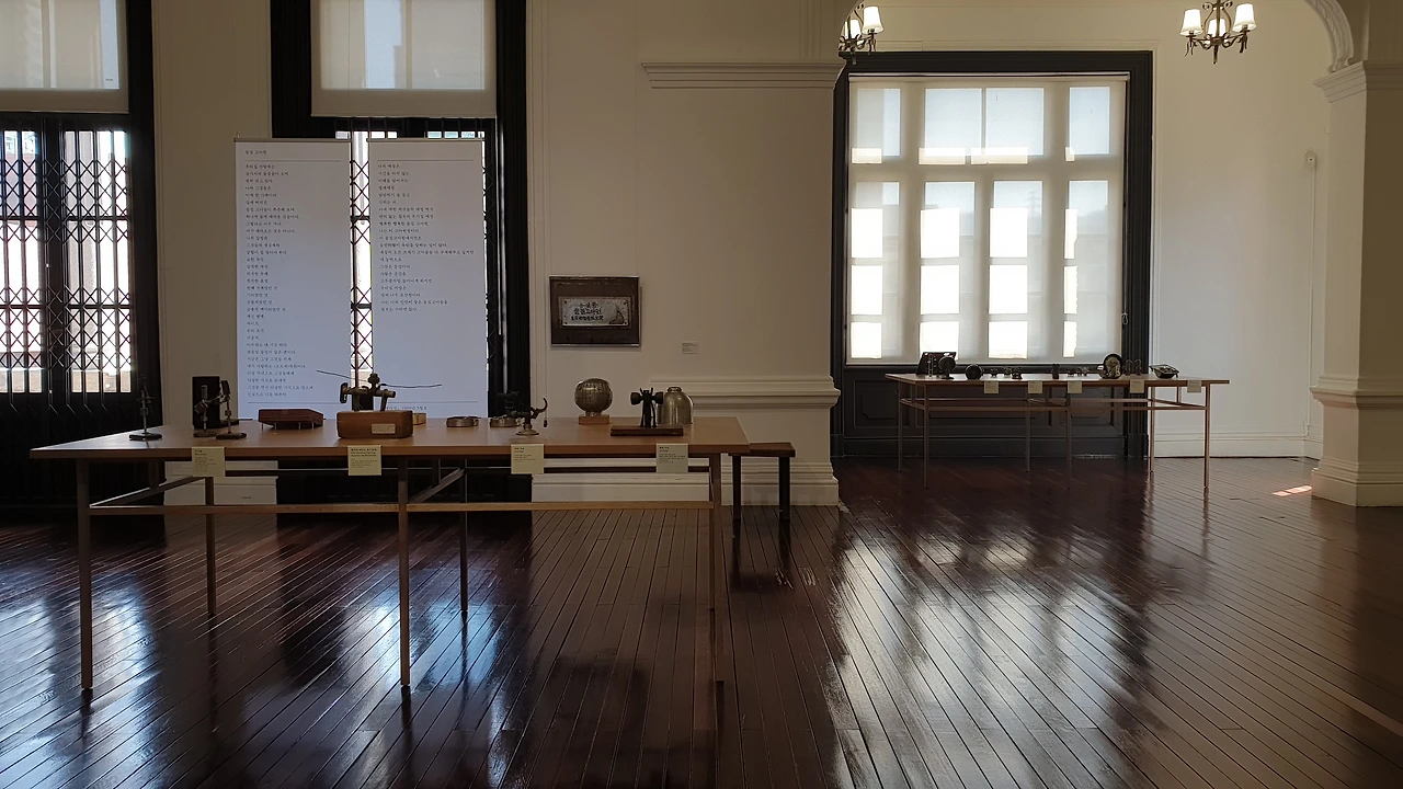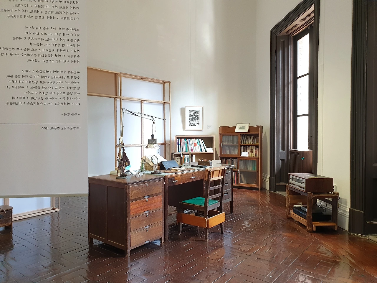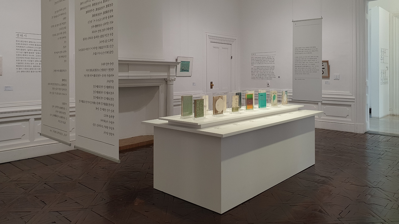 가장 먼저 섹션 1 '청금루: 작가의 서재'는 성찬경의 서재를 재현한 공간이다. '청금루(清襟樓)'는 '학문과 문학에 뜻이 있는 젊은이인 문청(文靑)이 모이는 곳'이라는 뜻이다. 전시를 끝까지 관람한 후 남서울미술관에서 성찬경의 회고전을 개최한 것이 정말 적절한 선택이었다는 생각이 들었다. 전시는 구 벨기에 영사관이었던 서울시립 남서울미술관에서 열리는데, 이곳은 지하 1층, 지상 2층으로 된 작고 고풍스러운 건축물이다. 유럽은 역사적인 건축물들을 박물관으로 사용하는 경우가 많아서 방 하나가 전시장의 한 구역이 된다. 그래서 이런 곳에서 열리는 전시를 볼 때면 누군가 살았던 곳에 방문했다는 생각에 특별한 기분이 들었다. 남서울미술관도 그런 기분이 드는 곳이었는데, 공간 스케일이 유럽의 궁전들에 비해 훨씬 가정집과 비슷해서 정말로 성찬경이라는 사람의 집에 초대된 듯 한 느낌이 들었다. 특히 햇살이 좋은 오전, 낮에 방문해 작품에 햇살이 비치는 모습을 보고 있으면 그 포근함에 마음이 녹아내린다.