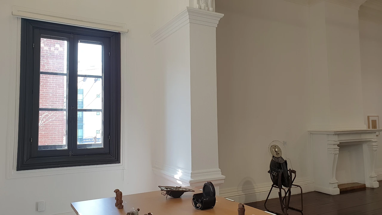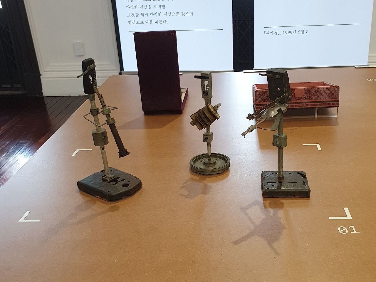 2층으로 올라오면 '유쾌하게 빌었다: 물질과 물권', '오오로라: 세상의 운율, 그림자 버스, 행복한 가정' 섹션에서 작가가 제작한 오브제들이 본격적으로 펼쳐진다. 성찬경은 자신의 집을 '물질고아원'이라 명명하고 간판까지 만들었는데, 버려진 물건들을 조합해 새로운 오브제로 만듦으로써 버려진 물질들에게 생명력을 불어넣었다. 우리가 평소 사용하는 나무 테이블을 닮은 좌대는 작품이 정말 성찬경의 작업대 위에 올라가 있는 듯 한 느낌을 준다. 또한 2층의 크고 작은 방들, 나무 바닥, 샹들리에, 그리고 공간 곳곳에 있는 창문과 난로 등 구 벨기에 영사관의 흔적들은 전시장을 더욱 집처럼 느끼도록 하는 요소들이다.