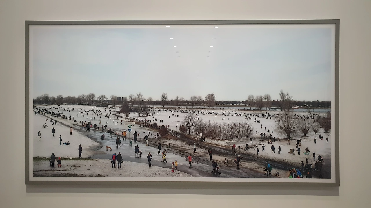 〈뮐하임 안 데어 루르, 낚시꾼〉은 멀리서 보면 평화로운 강의 모습을 담은 사진처럼 보인다. 하지만 작품을 가까이서 보면 오른쪽 아래에는 낚시꾼들이, 왼쪽 위에는 자동차 도로가 있다. 왠지 자동차 소리가 낚시꾼들의 조용한 일상을 방해할 것 같은 느낌이 든다. 거리에 따라 담고 있는 이야기가 다른 사진이다.