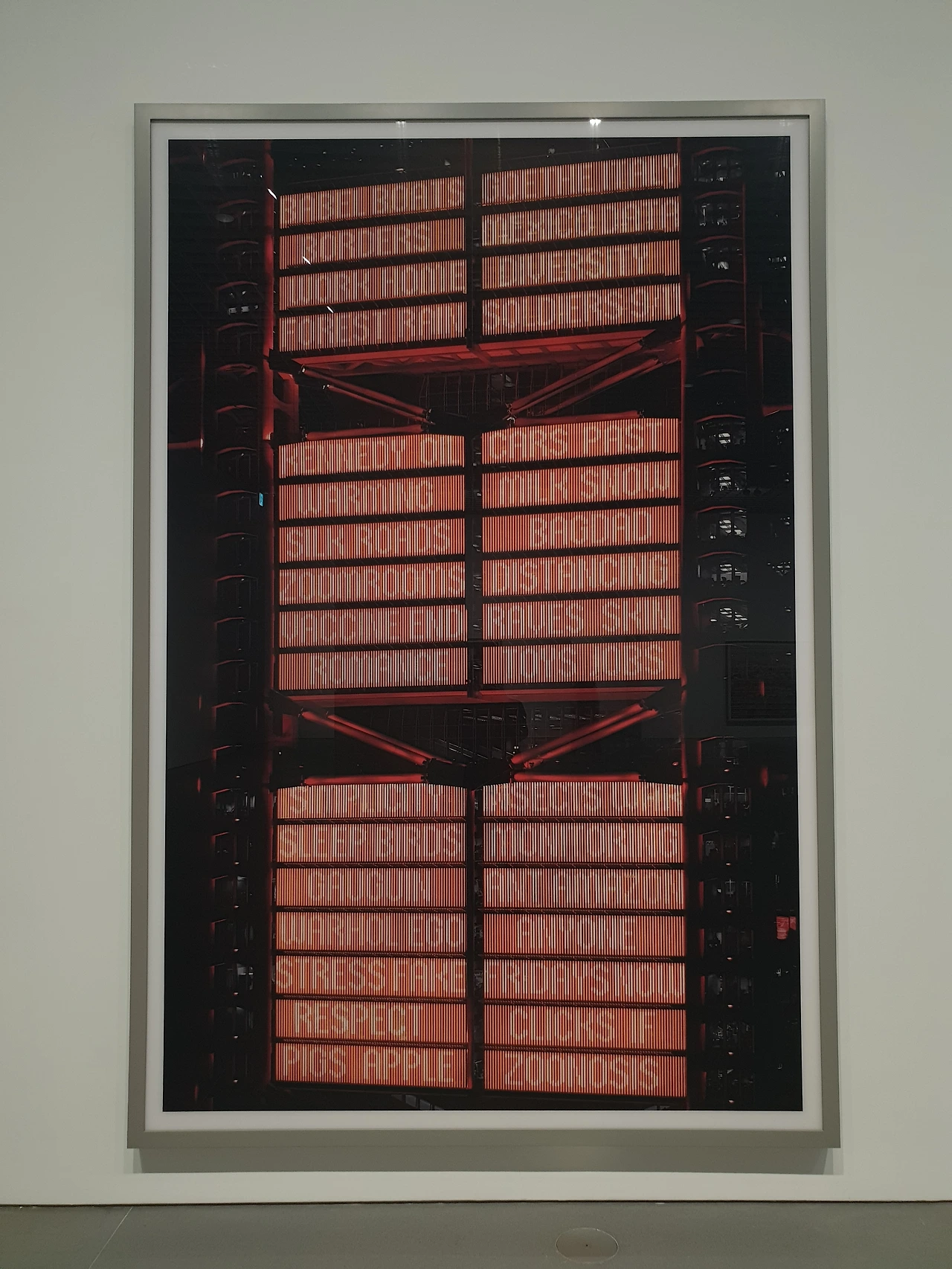 이곳의 넓은 폭과 높은 천정, 거대한 콘크리트 기둥과 일정한 규격으로 마감된 콘크리트 패널은 빈 공간 그 자체만으로도 거대하고 밀도 있게 짜인 느낌을 준다. 문명의 힘을 보여주는 안드레아스 거스키의 거대한 사진들은 이 공간의 기운을 압도하며 사람들의 걸음을 이끈다. 그는 사람보다 큰 스케일의 사진을 만든다. 보통 신체와 비슷하거나 더 작은 크기의 그림은 작품을 바로 앞에서 보나 몇 걸음 뒤에서 보나 감상에 큰 차이가 없다. 하지만 사람 스케일보다 큰 거스키의 작품은 전체 모습을 한눈에 감상하려면 족히 아홉 걸음, 어림잡아 환산하면 3~4m는 뒤로 가야 한다. 그런데 이렇게 멀리 떨어져서 보면 그의 사진에서 중요한 요소 중 하나인 '사람'의 모습이 잘 보이지 않는다. 사람을 관찰하기 위해서는 뒤로 갔던 만큼 다시 작품 바로 앞까지 걸어가서 작품을 뜯어보아야 사람을 발견할 수 있다. 이렇게 직접 몸을 움직여야 제대로 감상할 수 있는 그의 작품은, 마치 사진에 찍힌 거대한 공간을 그대로 축소한 스케일 모형 같다.