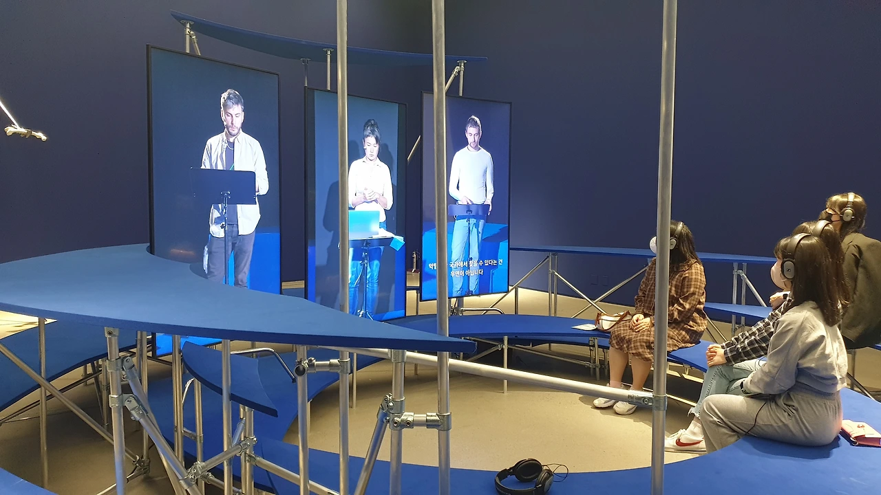 예를 들어, 〈미션 완료: 벨란시지〉는 토론 프로그램에서 발제하는 형식으로 제작된 영상으로, 모니터를 둘러싸고 있는 구조물이 패널 토론의 청중들이 앉아있는 공간처럼 구성되어 있다.본 전시에서는 작품마다 환경이 다르게 조성됨에 따라 관객이 앉는 의자도 선베드나 바위 같은 다양한 형태를 갖추고 있는데, 이 작품에서는 서있는 불편함을 줄이는 기본적인 기능뿐만 아니라 내용에 몰입하는데의자의 형태가 중요한 역할을 하고 있다.