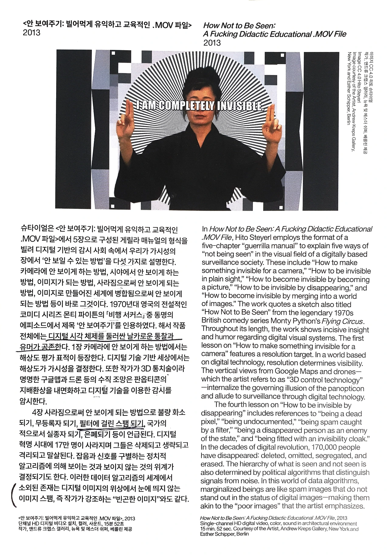 데이터 사회의 다양한 문제점을 제기하는 섹션 2~4는 실제 사건을 소재로 하여관람자가 개인의 경험을 토대로 작품에 더 깊이 몰입하도록 한다. 그중 섹션 2의 〈안 보여주기: 빌어먹게 유익하고 교육적인 .MOV 파일〉*은 우리의 모든 것을 추적하고 기록하는 디지털 사회로부터 자신을 숨기는 5가지 방법을 소개한다. 이를 통해 작가는 디지털 사회에서 기록은 사람이 아닌 기계가 남기고 있음을 경고한다.