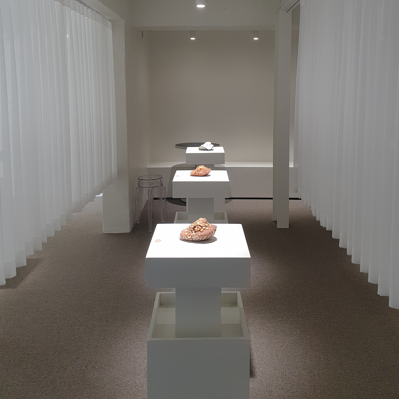 서문을 읽고 본격적으로 전시장에 들어선다. 12종류의 마들렌 모형이 캡션과 함께 좌대 위에 놓여 있어, 조각 작품을 감상하듯 마들렌의 생김새와 맛을 전시의 형태로 감상하게 된다.