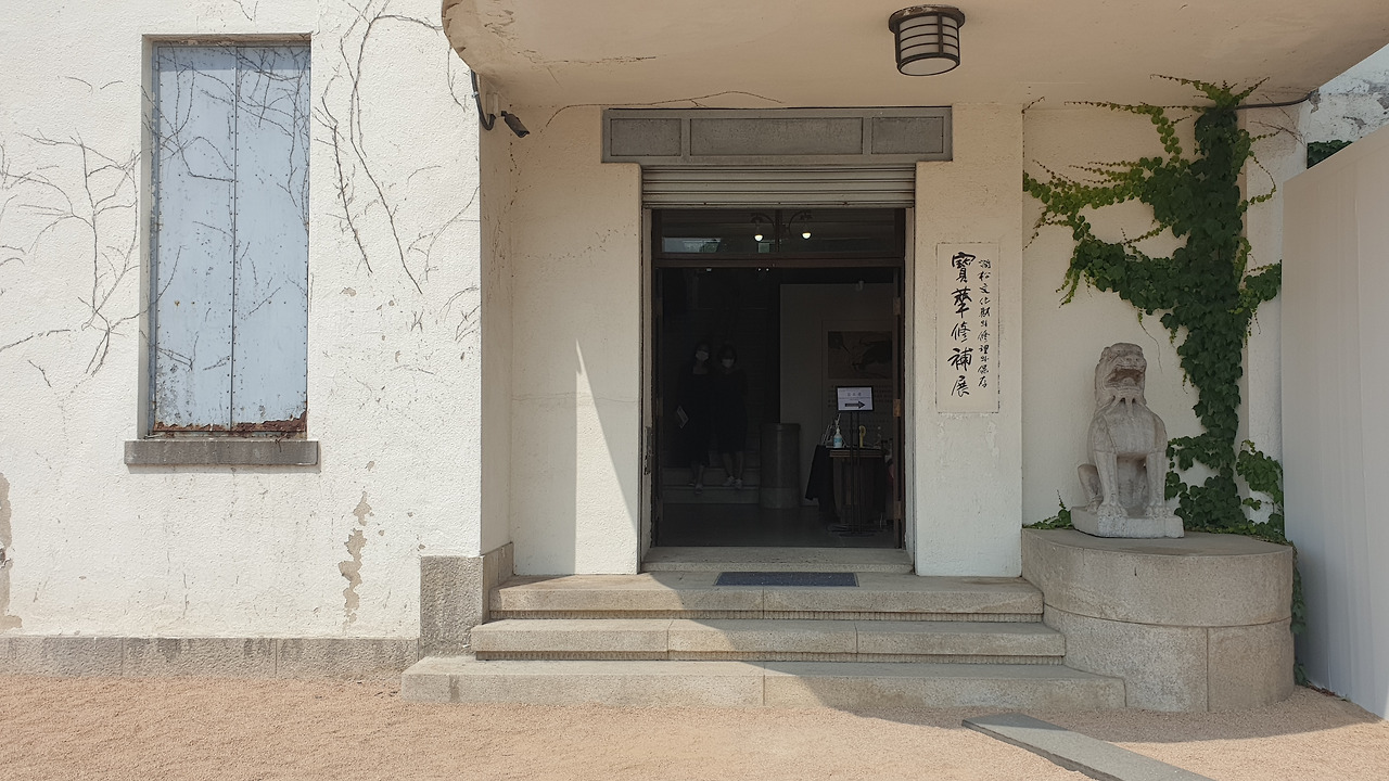 처음 전시실을 들어갈 땐 정신이 없어 로비를 볼 생각을 미처 하지 못했다. 2층 전시실까지 관람한 뒤 내려오는 길에서야 비로소 로비를 살펴볼 여유가 생겼다. 로비라고 부르기보다는 현관이라고 부르는 것이 더 적합한 아담한 크기지만, 간송미술관의 사진 자료를 보면 1938년 당시의 사람들은 현대인들보다 훨씬 체구가 작았기 때문에 아주 작다는 느낌을 받지는 않았을 것 같다. 전시실의 조명은 별다른 장식 없이 단순한 형태인데 비해 로비의 조명은 곡선 프레임에 백열등이 달려있어 적절한 장식이 되었고, 출입문도 유리로 되어 개방적인 느낌을 주었다.