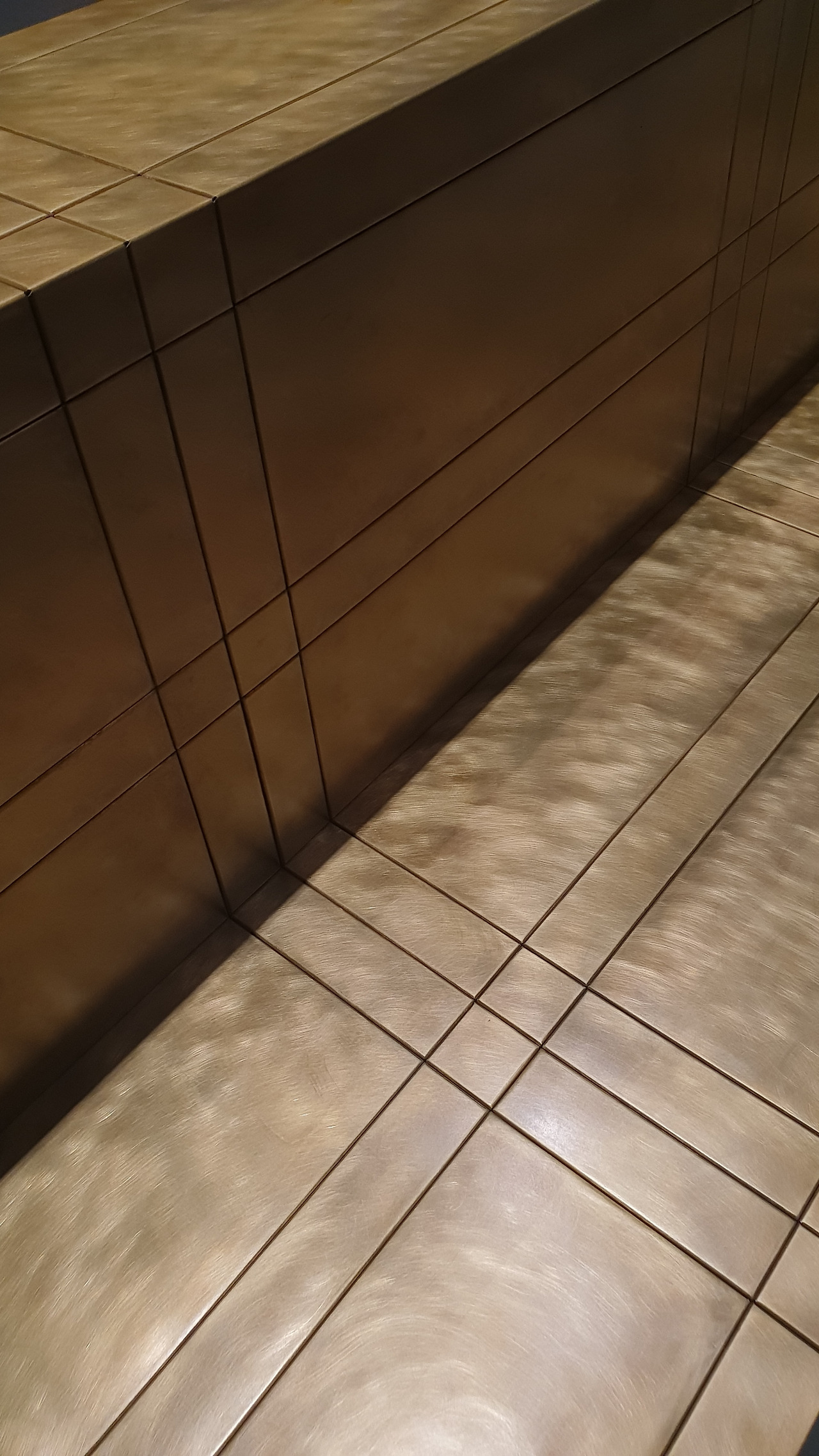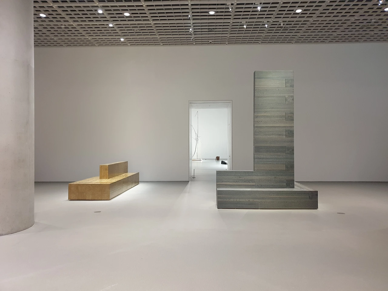 1 전시실로 들어가면 기다란 조각이 고요하게 놓여 있다. 조각이기도 하지만 가구로서 앉을 수 있는 작품이다. 다른 재질의 돌들이 켜켜이 쌓여 한 덩어리의 조각이 되고, 하나의 금속 표면에 규칙적인 홈으로 나뉜 모습으로부터 미술관 건축의 모습이 보인다.