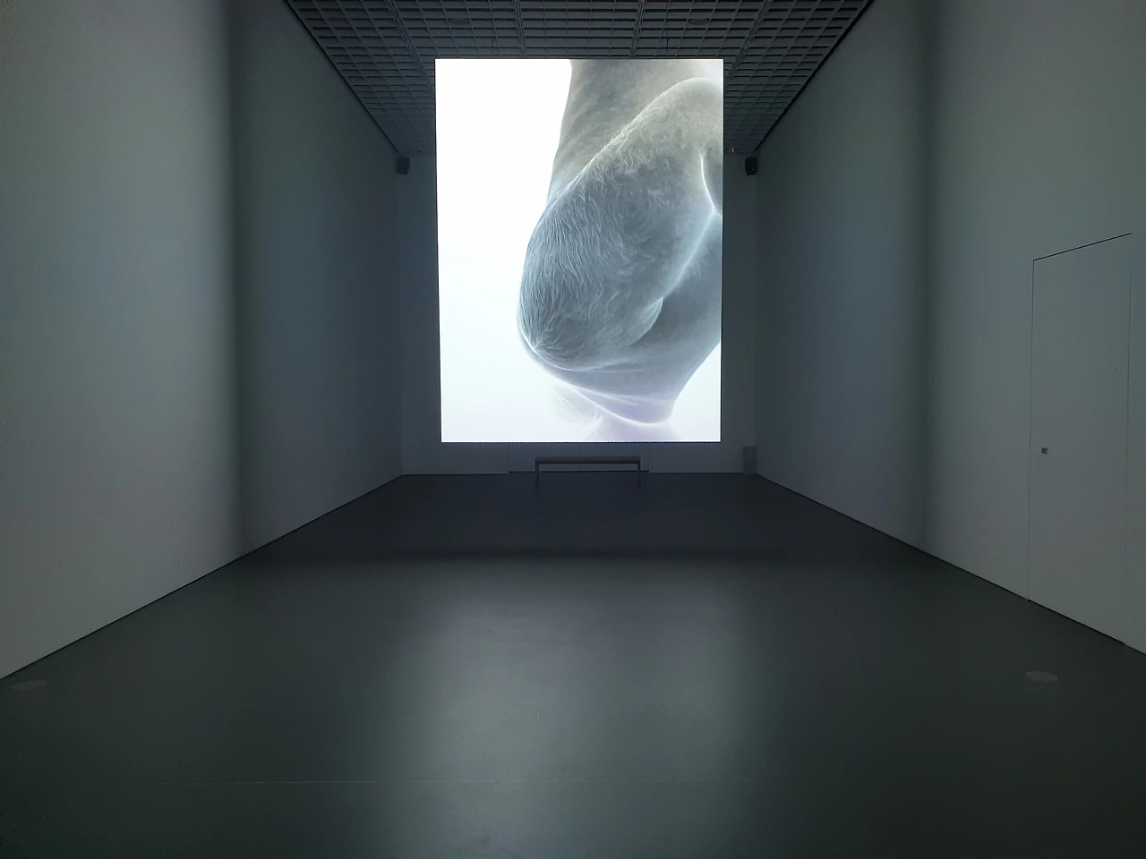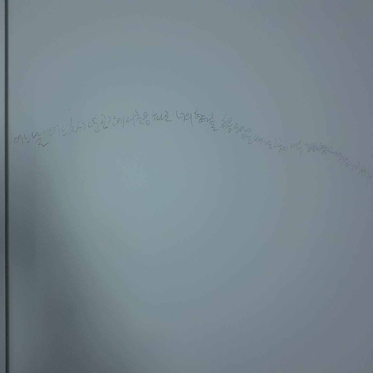 1 전시실 안쪽에 위치한 2 전시실은 공간 자체가 자궁처럼 느껴진다. 뒷면끼리 마주한 화면에는 각각 태아와 자연의 모습이 흘러나오고, 전시장을 둘러싼 벽면에는 작가가 직접 쓴 글귀가 선을 이루는데 멀리서 보면 글자들의 흐름이 꼭 태아의 심장 박동을 시각화한 그래프처럼 보인다. 전시 개막에 맞추어 작가분의 첫 딸이 태어나게 되어 그 순간을 공간에 담긴 작품으로 치환한 것이다.