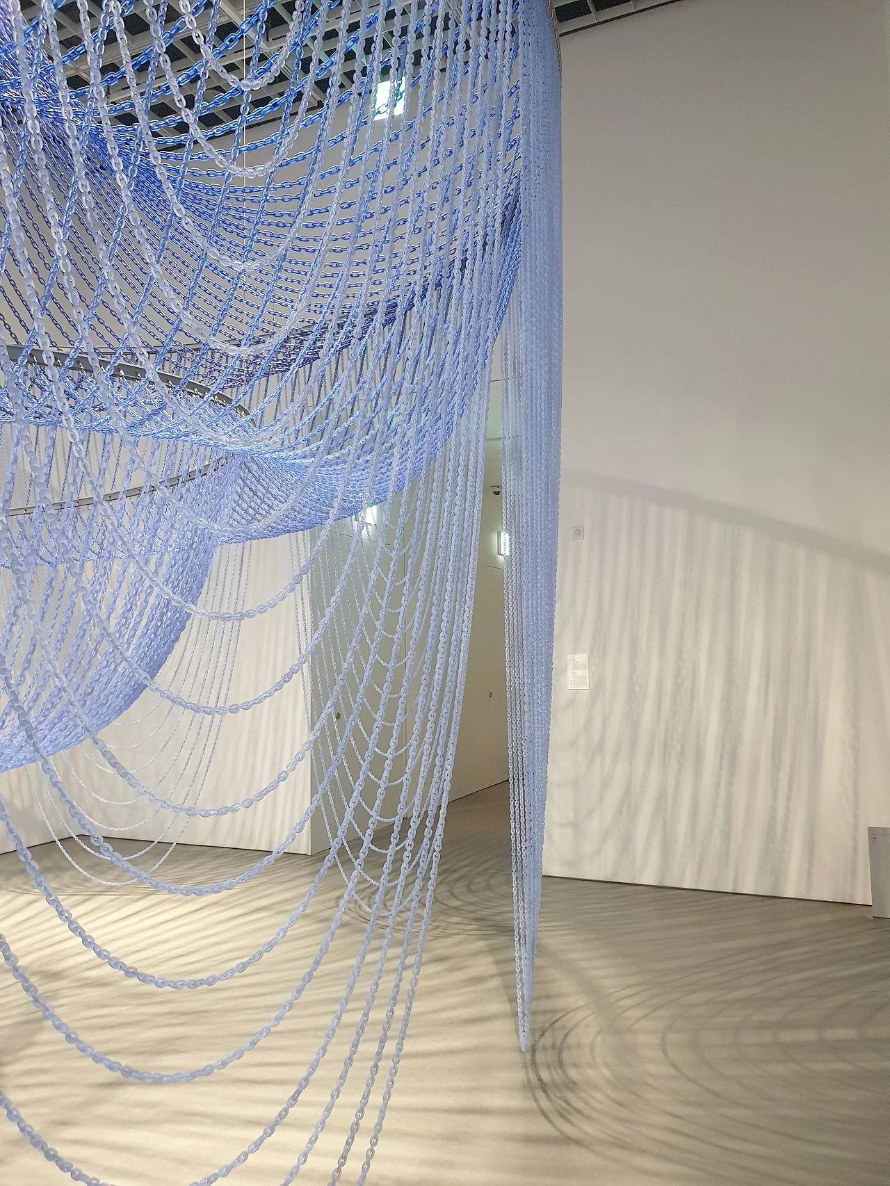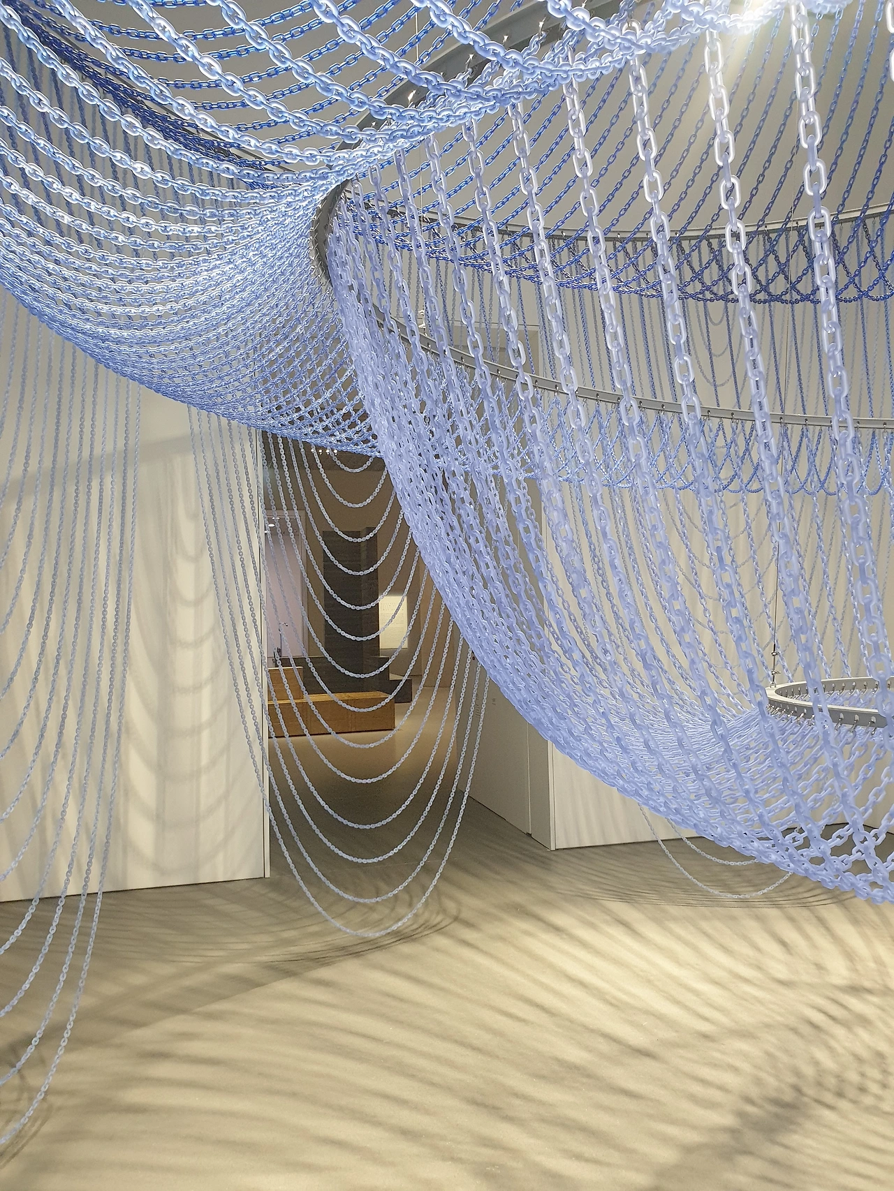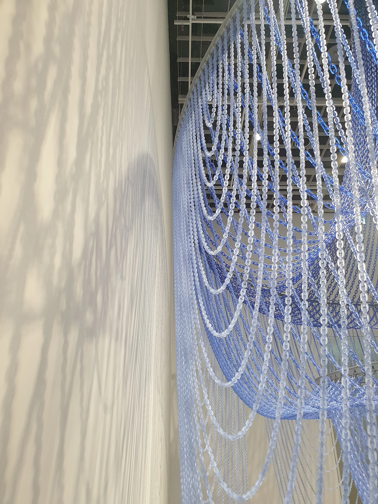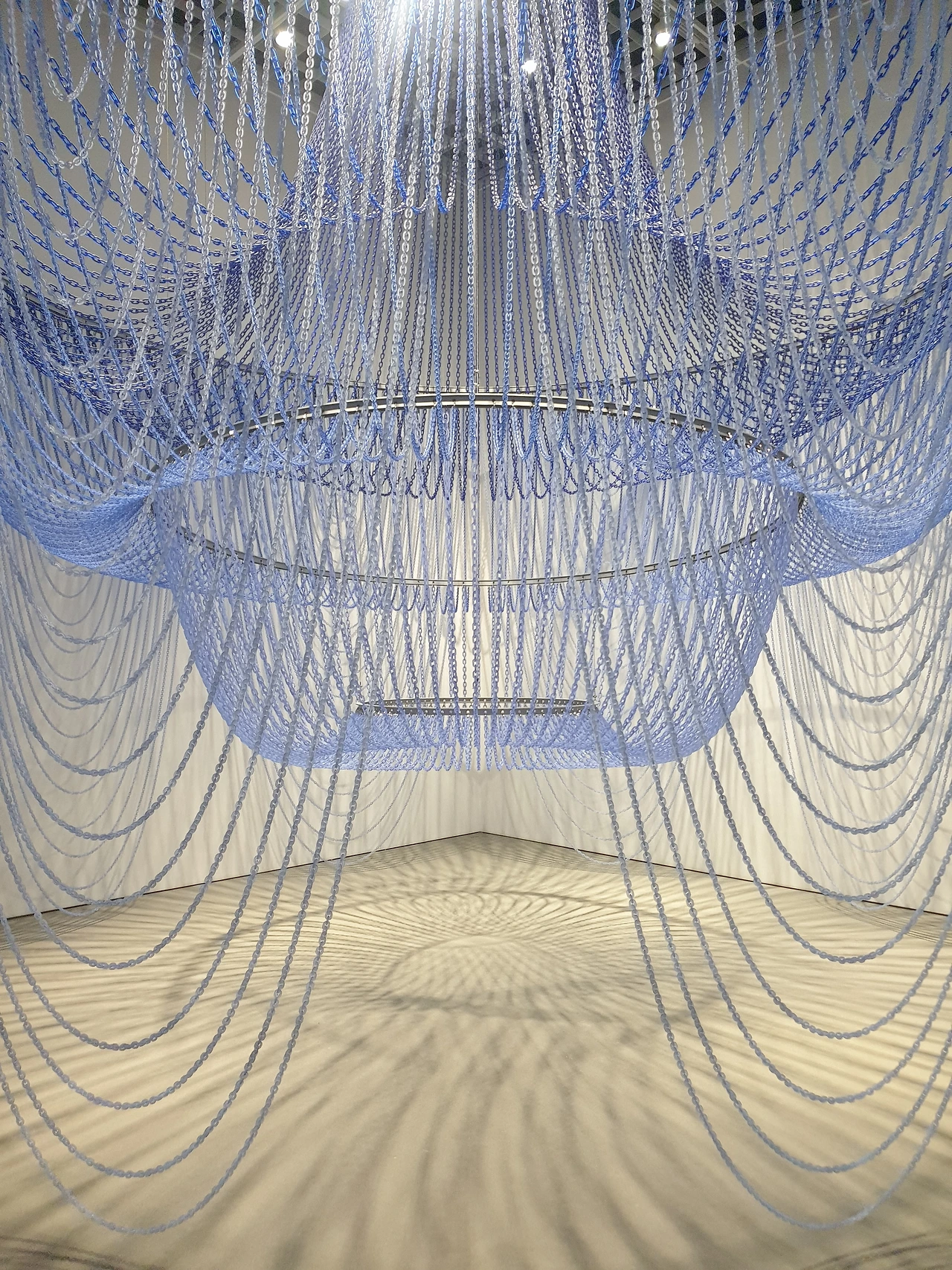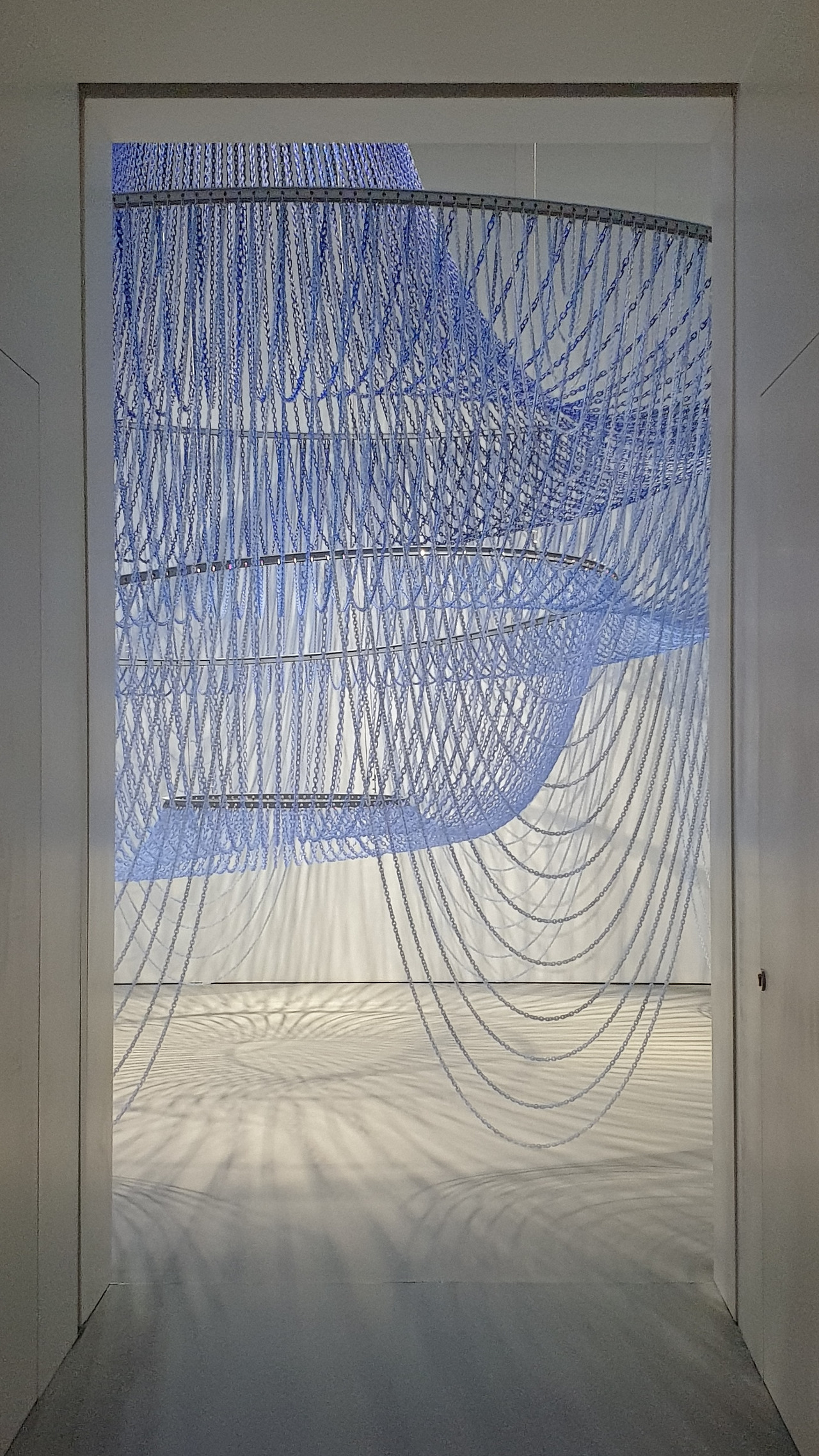 3 전시실 역시 하나의 작품으로 가득 차있다. 체인을 걸어 만든 샹들리에가 육면체의 안쪽 면과 거의 내접할 정도로 크다. 그래서 카메라로는 작품을 한눈에 담을 수도 없는데, 체인이 만들어내는 곡선이 벽과 바닥에 맞닿아 다양한 곡률의 선이 육면체 내부에 그려진다. 아마 샹들리에의 뼈대와 체인을 전시장 내부에서 조립해 설치하지 않았을까 싶은 상상력을 자극하는 작품이다.