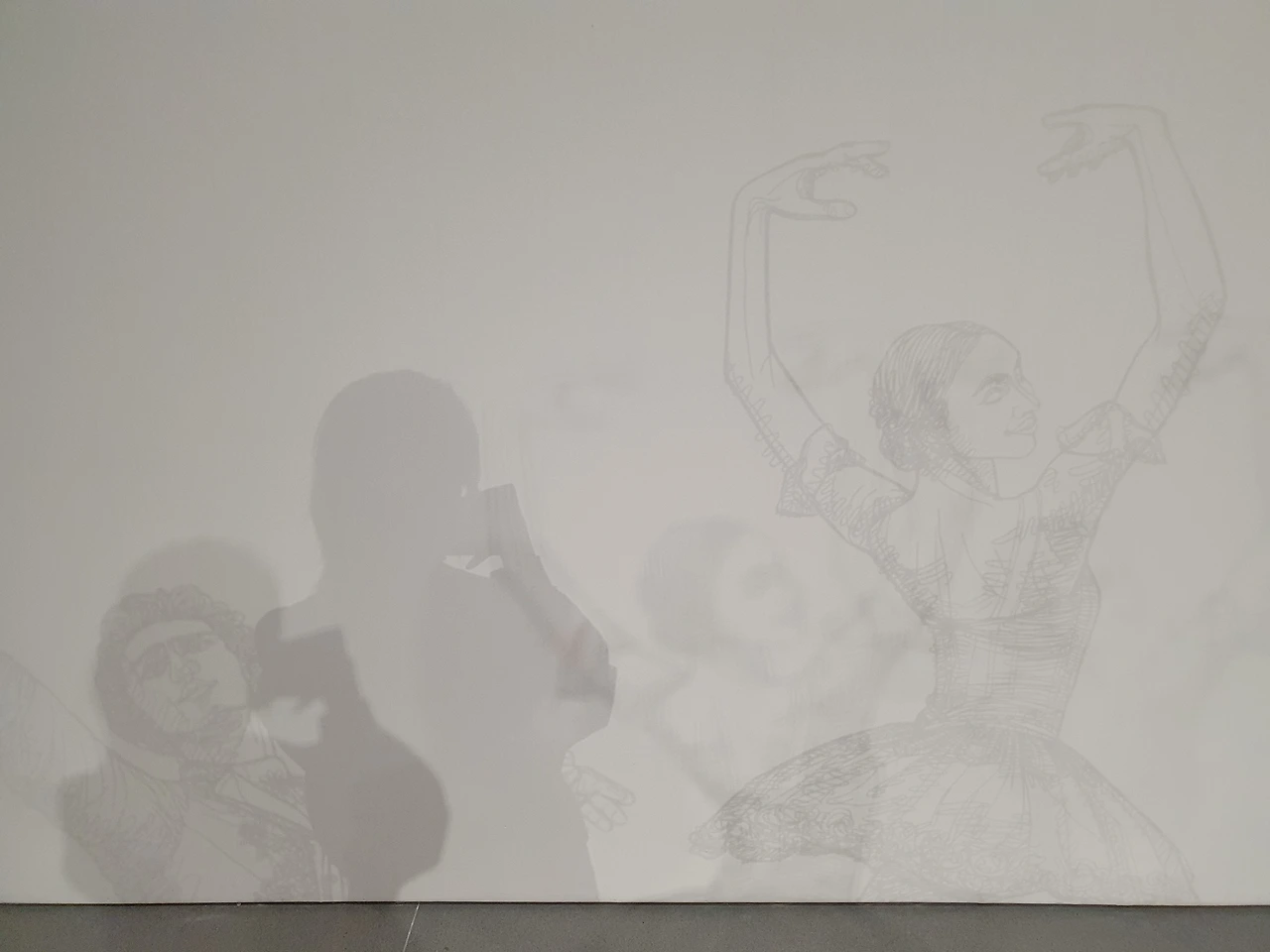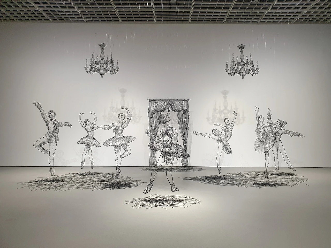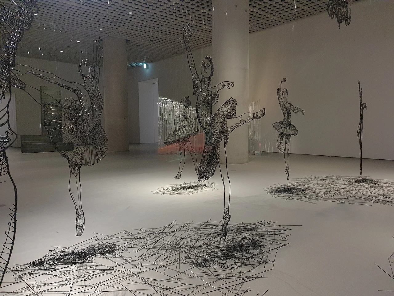 그 맞은편에는 평면과 입체의 경계에 놓인 듯한 철사 드로잉 작업이 설치되어 있다. 철사를 구부려 발레리나의 공연을 표현했는데, 조명을 통해 벽과 바닥을 두 가지 성격으로 활용한 것이 인상적이다. 작품 간에 간격을 두어 관객이 작품 사이를 거닐 수 있다는 점에서는 무대라는 입체적 성격이, 작품 그림자를 벽에 비추어 또 다른 장면을 연출했다는 점에서는 도화지 같은 평면적 성격이 드러난다.