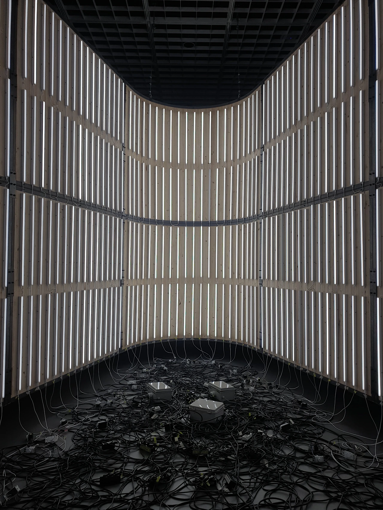 4 전시실에서는 홍수현 작가님의 작품이 눈에 띈다. 작품을 구성하는 수백 개의 조명은, 마치 밤늦은 시간 아모레퍼시픽 본사 건물을 외부에서 보았을 때 수천 개의 루버 사이로 뿜어져 나오는 조명 빛을 보는 것 같다. 실외의 풍경을 자연광이 차단된 실내로 들여온 점이 흥미롭다.