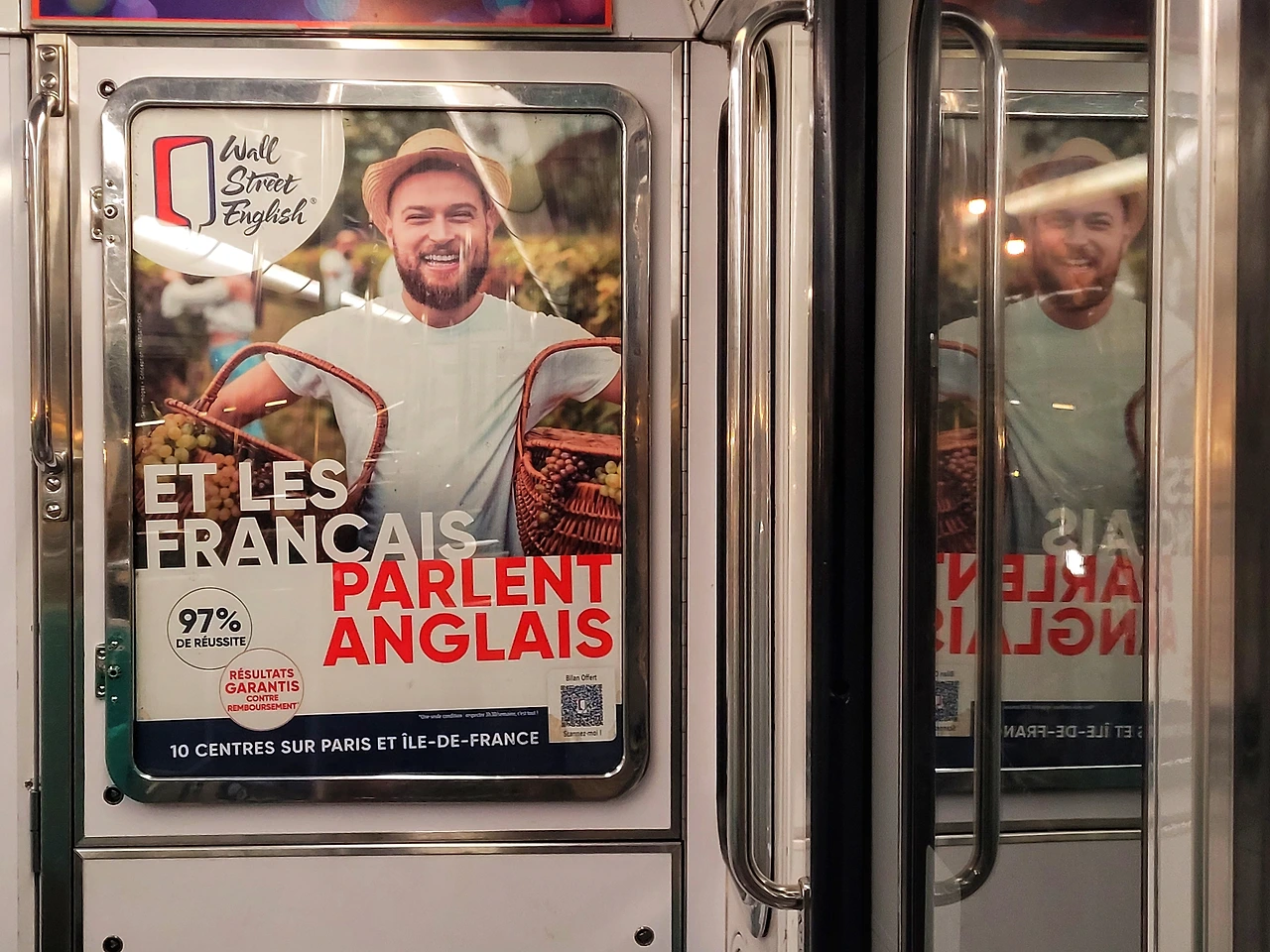영어로 물어도 아무렇지 않게 불어로 설명해 주는, 때론 집을 찾지 못하는 택배 기사에게 프랑스말을 배워라라고 잔소리를 듣기도 하는, 빵 주문하다가 프랑스어 발음 교정을 받기도 하는 프랑스의 삶. 하지만 10년 전에 비하면 프랑스인의 영어 실력이 엄청나게 늘었다고는 한다. 물론 나도 배우고 싶지만 숫자를 세려면 암산을 해야 될 정도로 복잡한 프랑스어의 장벽은 너무 높다. (이런 식이다. 70은 60+10, 80은 20 ×4, 90은 20 ×4+10..) 표정과 상황으로 언어를 독해하는 눈치 능력만 늘었다. 지하철에서 만난 문구 '프랑스인들은 영어를 말합니다.' 영어 학원 광고라지만, 그래도 보고 있으면 피식한다.