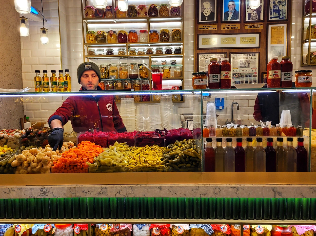이스탄불 관광지 대부분은 유럽에 몰려있다. 아시아는 주로 주거지역. 그래서 일상을 보기에 더 적합하다. 시장에 왔는데 아시아에 위치해서인지 뭔가 더 동양적인 느낌이 강하다.(그럴 리가.. 같은 이스탄불인데) 인상적인 건 절임 음식. 절일 수 있는 모든 재료를 담가놨으며, 얼마 전부터 이 가게에선 김치를 팔기 시작했다. 한국인을 본 사장님은 내게 김치 맛의 객관적이고 엄격한 평가를 부탁하셨다. 김치계의 로버트 파커가 된 기분으로 한참을 음미했다. 어디서 어떻게 재료를 구했기에 이리 한국의 김치맛을 똑같이 재현했나 진심 놀랐지만 사장님이 계속 노력하실 수 있게 10점 만점에 7점을 드렸다.