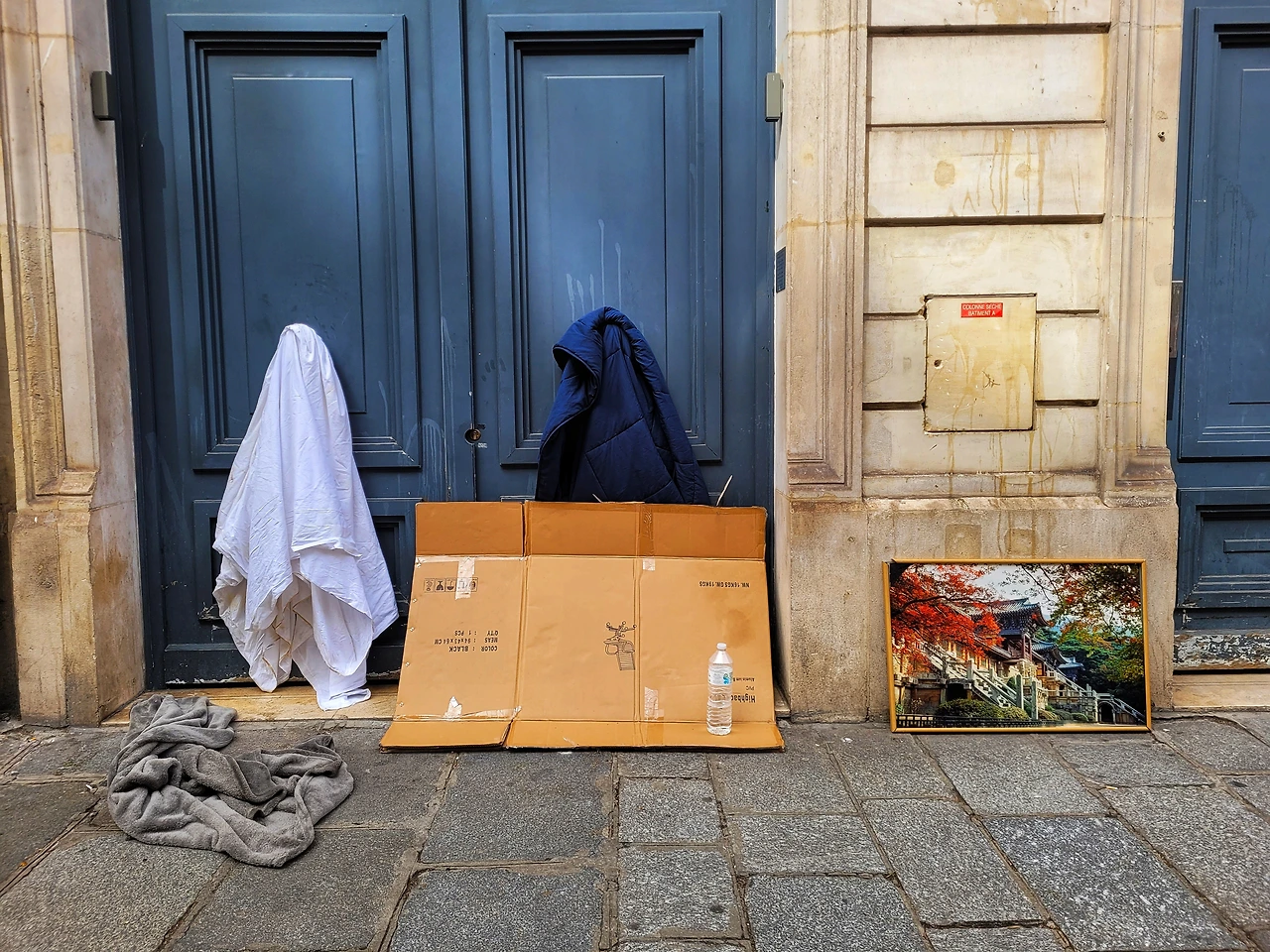 예전 아이 친구 학부모 중 한 분은 아이가 말을 안 듣거나 공부를 게을리할 때마다 입버릇처럼 '너 그러다 거지된다'라고 말씀하셨다. 교육적 옳고 그름을 떠나 효과가 좋았고, 한 번은 거지 사진을 검색해 보여준 적도 있다고 하셨다. 프랑스에 와서 그분이 떠올랐다. 왜냐면 그분의 거지 협박이 프랑스에선 안 통할 것 같기 때문이었다. 특히 파리 강서 쪽(서안) 거지들은 구걸을 하는 행위를 빼면, 알렉산더 대왕에게 해를 가리고 있으니 좀 비켜달라고 말했던 그리스 견유학파 디오게네스 같은 삶을 살고 있다. 이웃들이 갖다 주는 음식으로 요기하고 구걸해서 받은 돈으로 싸고 독한 맥주를 마시다가 숙취 몰려오면 그냥 자는 자유로운 삶. 사무실 앞에도 한 분 계신데, 출근할 때마다 따뜻한 바람이 나오는 지하철 환풍기 위에서 꿀잠 자고 있는 그분을 보며 가끔 부럽단 생각을 한 적도 있다. 여긴 침실이고 업무는 다른 곳에서 보는 건지, 낮에는 자리를 비우신다. 가끔 꽃이나 인형으로 침실을 꾸미기도 하는데 오늘은 큰 사진을 하나 구해 놓으셨다. 뭔가 익숙한 이미지라 자세히 들여 보니 경주 불국사 사진이다. 한류 열풍의 영향인가. 저 사진은 어쩌다 여기까지 오게 됐을까. 여하튼 저분의 심미안 하나는 인정해 드려야겠다.