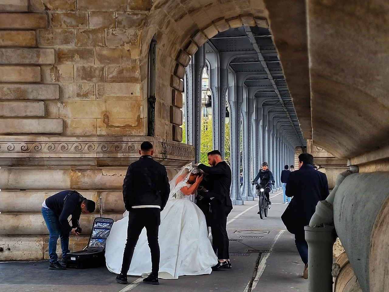 파리의 5월을 상상하며 웨딩 촬영을 예약한 커플. 상상의 나래를 펴보자. 이들은 불청객 꽃샘추위나 소나기의 난입을 우려해 최대한 보수적으로, 그러니까 5월 중순으로 파리 스냅사진 일정을 잡았을 정도로 용의주도한 커플이었을 게다. 지난주 파리 장마가 시작됐을 때만 해도 비 온 직후의 맑은 파리를 상상했겠지. 하지만 가는 날이 장날이라더니, 오늘 강풍을 동반한 폭우가 내렸다. 비를 피해 비르하켐 다리로 대피했지만 다리 사이를 지나는 계곡풍은 더 강해졌다. 결국 참다못한 아내는 분노 섞인 슬픔을 토해냈고, 남편은 파리 장마가 자기 탓이라도 되듯, 악천후에 웨딩드레스 입고 고군분투하는 아내에게 미안함을 표했을 수도. 파리는 하필 왜 우리에게만 이런 시련을 주는 건가 속상해하는 듯한 커플의 표정을 보니 이 말이 떠올랐다. '파리가 원래 좀 그래요. 생긴 거랑 달리'