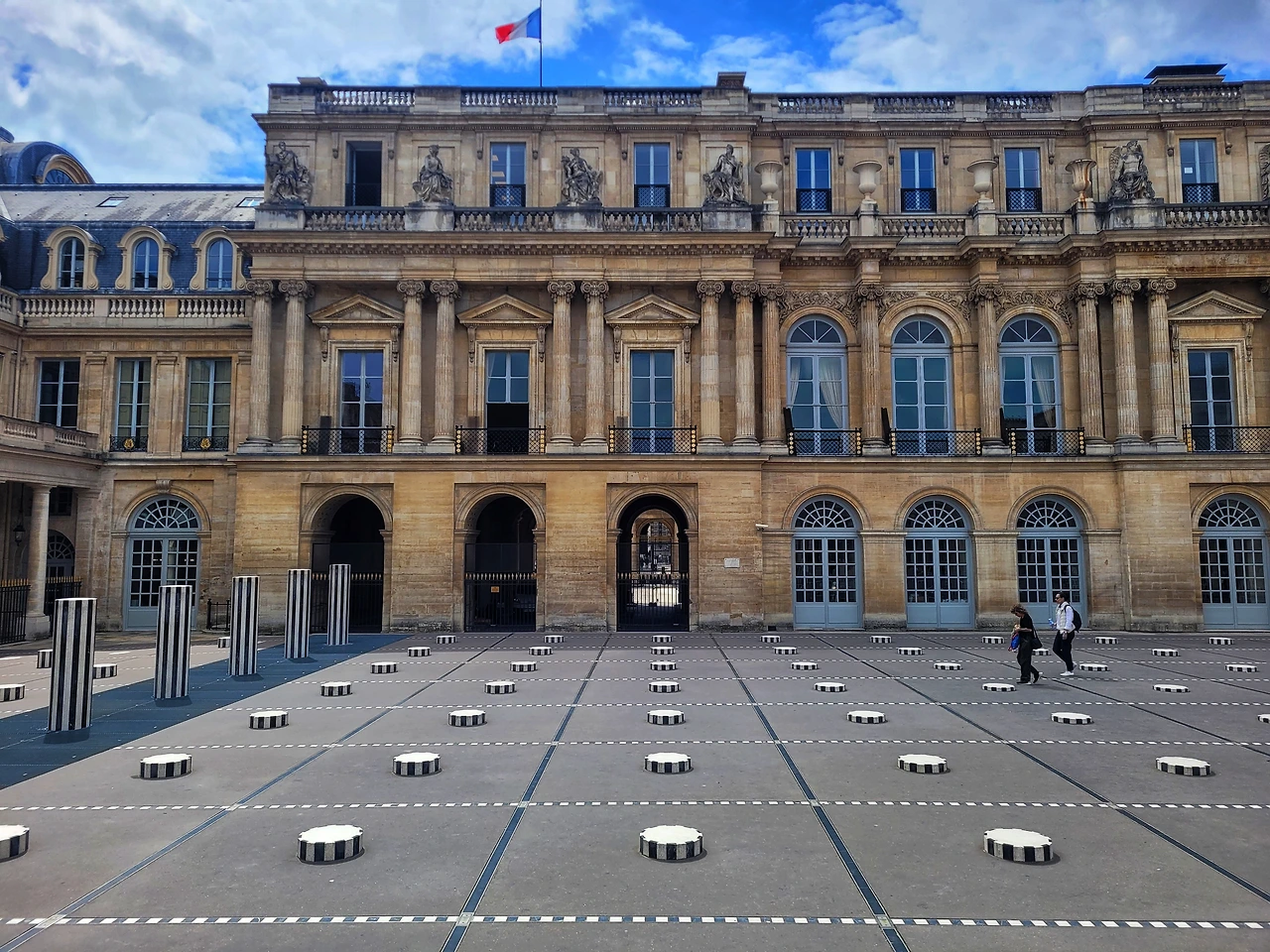 관광객이 늘 붐비는 유럽은 이제 그만 좀 오라는 소리를 하고 있지만, 사실 내 입장 선 조상 잘 만나 혜택을 보면서 참 배부른 소리를 하고 있구나 싶다. 오랜 역사가 남겨준 유산 덕에 별다른 홍보 없이도 관광객을 끌어 모으는 건데, 로마만 해도 포로 로마노, 콜로세움을 10분 거리에서 동시에 볼 수 있고 도심에 판테옹 같은 유적지가 50년 전 지어진 건물인양 쿨하게 서있다. 그런데 파리 앞에선 부모 잘 만났다는 비아냥이 덜 나오게 된다. 에펠탑 같은 건, 당대의 강력 저항에도 불구하고 탄생했으며, 탑의 이질적인 모습을 생각하면, 탑을 세우기로 결정한 파리의 혁신에 감탄하게 되기 때문. (물론 모파상 같은 작가는 에펠탑 보기 싫어 파리를 떠나기도 했지만) 루브르 박물관 앞의 유리 피라미드는 또 어떤가. 그들은 기꺼이 중국계 미국인 건축가 페이 Pei의 파격적인 아이디어를 받아들이며 파리의 또 다른 랜드마크를 만들어냈다. 사진의 팔레 후이얄 정원의 설치물도 파리 혁신의 완벽한 예시다. 페이의 유리 피라미드가 세워질 즈음, 프랑스는 다니엘 부렌 Daniel Buren의 '사진 기념품'제작을 후원했고, 작품 이름처럼 많은 관광객이 이곳에서 다채로운 사진앵글을 탐구한다. 심지어 기둥에 올라갈 수도 있으니 아이들도 지겨워하지 않으며, 최근 옆 정원에서 에밀리 파리가다를 촬영하며 그나마 많던 관광객이 더 몰리고 있다.