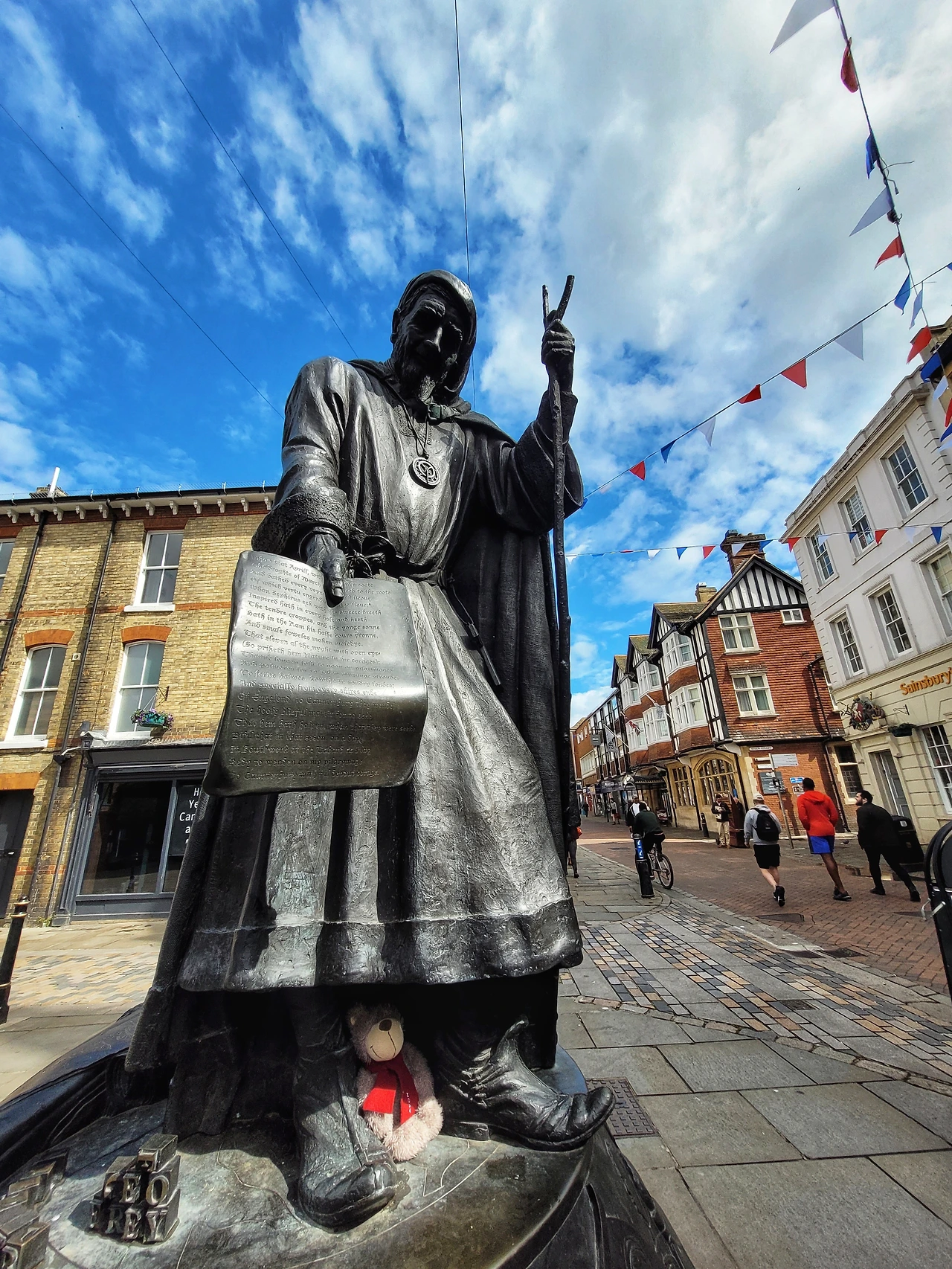 대성당으로 유명한 캔터베리는 5-6세기 앵글로색슨족의 주요 도시였던, 아주 오래된 마을이다. 유럽 역사를 어렵게 만드는 또 다른 요소가 바로 복잡한 민족. 켈트족, 앵글로색슨족, 노르만족, 갈리아족 등등. 우리 눈엔 영국 언저리 사는 똑같이 생긴 민족 같지만, 사실 캔터베리는 켈트족을 프랑스로 몰아내고 이 구역을 장악한 앵글로색슨족의 도시였다. 물론 앵글로색슨족도 10세기가 지나면서 노르만족에게 밀려나게 된다. 도심 중앙에서 만난 제프리 초서 Geoffrey Chaucer는 노르만족이 가장 강력하던 14세기 시절, 런던에서 살던 영국 문학의 아버지다. 영문과를 졸업한 나는 동상을 보자마자 <캔터베리 이야기>를 떠올려 유식함을 자랑했지만, 내용을 묻는 질문에 바로 무식한 사람이 됐다. 영어 독해도 쉽지 않은 내게, 영어는 상놈들의 언어라며 노르만어와 프랑스어를 주로 사용하던 귀족 초서가 영어로 쓴 작품을 어떻게 읽을 수 있겠는가. 게다가 산문이 아닌 운문. 라틴어(처럼 보이는)로 적힌 시를 읽는 건 분명 내 능력 밖의 일이었을 텐데, 마치 흑마법사처럼 디자인된 초서 동상이 글 내미는 포즈를 취하고 있으니, 어찌 넌 영문과 졸업생이 내 작품도 읽지 않을 수가 있냐고 꾸짖는 느낌이다. (국문과 졸업생이 홍길동전 내용도 모른다고 생각하면 혼나는 게 맞는 것 같기도..)
