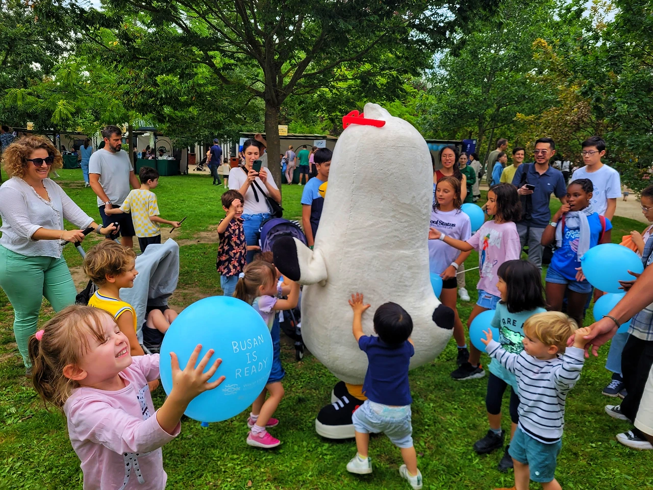 정작 한국에 있으면 모를 수 있지만, 국제박람회기구 본부가 있는 파리엔, 부산엑스포 홍보물이 곳곳에 설치돼 있고, 다양한 행사들이 열리면서, 우리 정부가 엑스포 유치에 얼마나 올인하는지 느낄 수 있었다. (정작 마크롱 대통령은 홍보에 김이라도 빼듯 사우디의 리야드 지지를 공개적으로 밝혔다) 주말 프랑스 한인회의 추석 축제가 한국 정원(그렇다. 파리에 한국 정원이 있다!)에서 열렸고, 대사관 직원들은 부스를 설치해 부산엑스포 유치를 홍보하고 있었다. 대사관에선 부산엑스포 마스코트 '부기(부산갈매기)' 대형 인형탈까지 제작했다. 만들고 보니 사이즈가 커서 탈을 쓰고도 무릎이 나오려면 최소 키가 180은 돼야 했다. 게다가 탈 쓰겠다는 아르바이트생이 즐비한 한국과 달리, 프랑스의 인건비는 만만치 않기에, 180 넘는 대사관 직원들이 돌아가며 탈을 쓰고 있었다. 아직 여름의 열기가 남아있는 초가을, 한인회 추석 행사에 어김없이 등장한 부기(대사관 직원)는 몰려드는 꼬마들의 공격에 뒤뚱거리고 있었고, 난 웃고 있는 부기 얼굴 뒤에 숨겨진 키 180 넘는 대사관 직원의 표정을 떠올려보려 애썼다. 한인회 행사엔 프랑스 사람들도 많았는데, 노령층을 위한 국악 공연, 젊은 세대를 위한 K팝 댄스, 초등학생들을 위한 태권도 격파 시범이 있던 것과 달리 유아를 위한 프로그램이 없어 아쉬웠는데 부기가 그 부족함을 잘 메웠다.