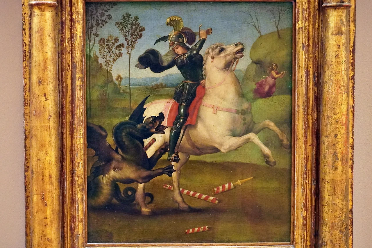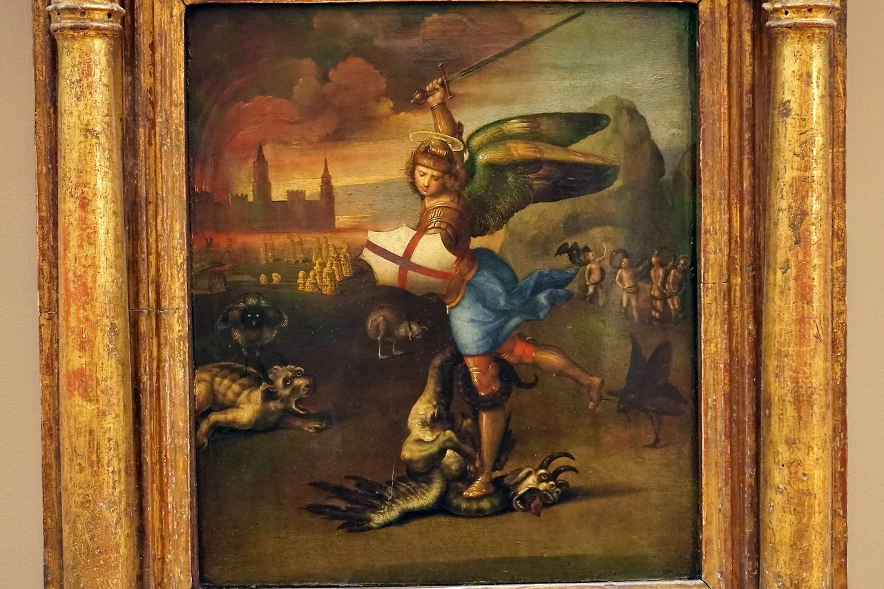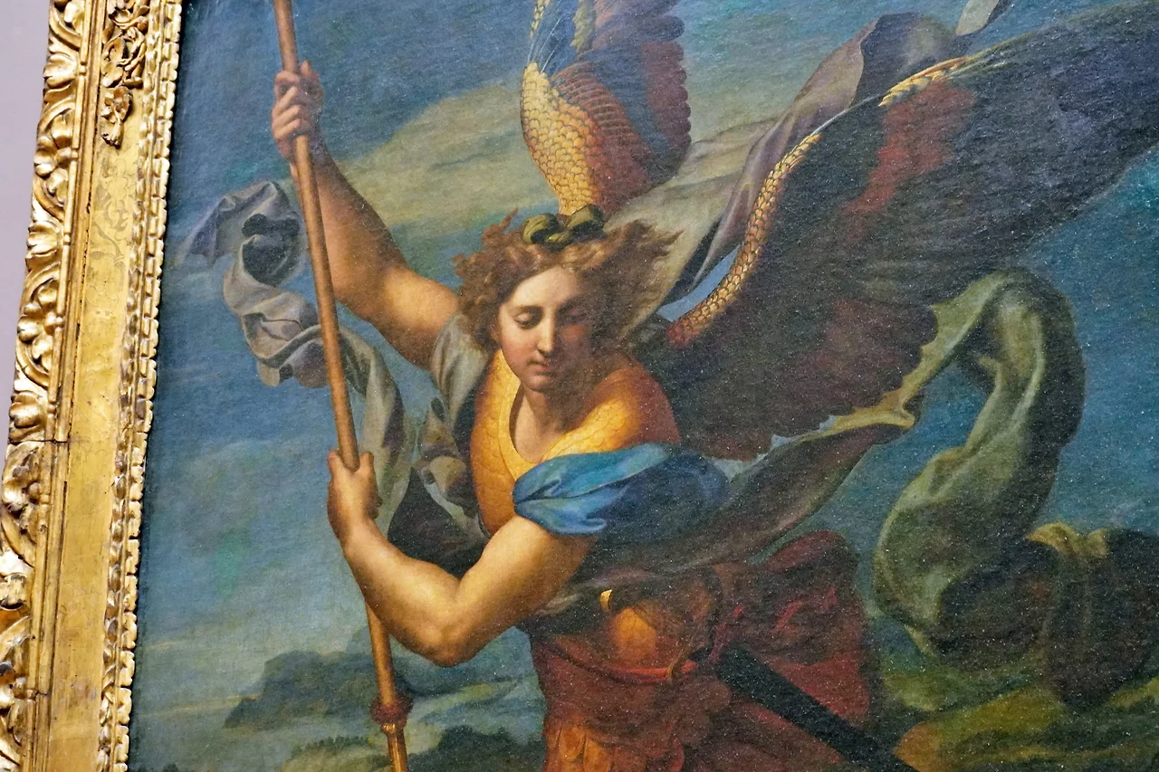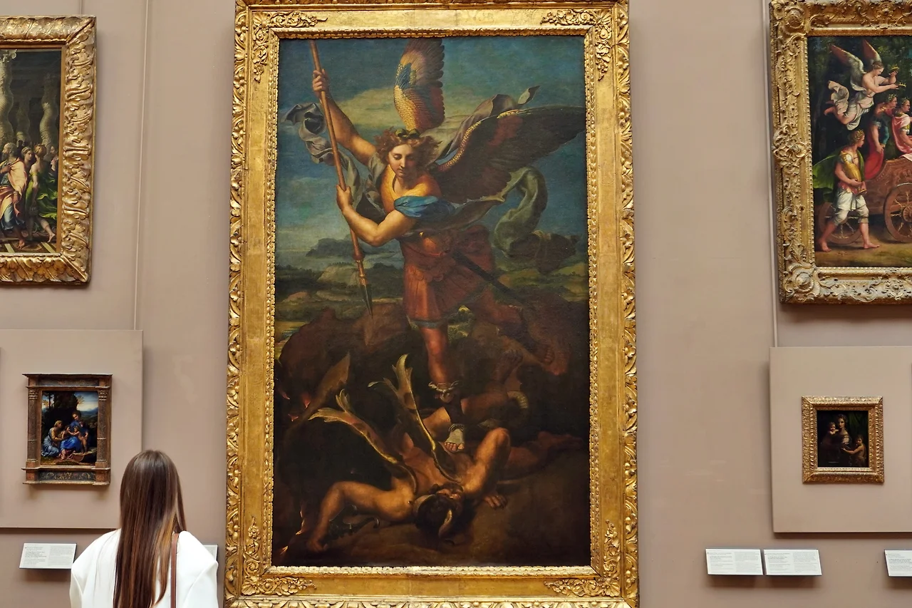 라파엘로는 레오나르도 다빈치와 미켈란젤로보다 후배였습니다. 하지만 거인의 어깨 위에 올라, 선배들이 개척한 회화의 위대한 기술을 본인의 것으로 만들었습니다. 레오나르도 다빈치에겐 천재적인 창의성, 미켈란젤로에겐 정력적인 에너지가 있었다면, 라파엘로에겐 그 어떤 기술도 쉽게 습득해 본인의 방식대로 활용하는 흡수력이 있었습니다. 마리아가 아래를 내려다보는 새초롬한 표정은 라파엘로가 처음 들어갔던 공방의 스승 페루지노의 영향인데, 라파엘로는 그 스타일을 아예 자신의 것으로 만들어버렸죠. 여기에 라파엘로를 위대하게 만든 점이 ‘구도’입니다. 루시퍼를 무찌르고 있는 <위대한 대천사 미카엘>을 보면 역시나 라파엘로 그림 특유의 차분함과 편안함이 느껴지지만, 동시에 미카엘 천사의 움직임이 가장 역동적인 순간을 포착했습니다.