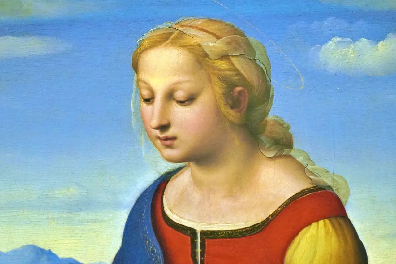 라파엘로의 그림을 보면 어려운 노래도 쉽게 부르는 가수가 떠오릅니다. 하지만 쉽게 부른다고 그 노래가 쉽다는 의미는 아니죠. 라파엘로의 그림은 엄청난 기교나 화려함이 느껴지지 않습니다. 그래서 편안하게 볼 수 있지만, 동시에 위대한 그림처럼 여겨지지 않죠. 하지만 그림을 뜯어보면, 레오나르도 다빈치나 미켈란젤로에게 절대 뒤처지지 않다는 걸 알 수 있습니다. 마리아의 얼굴을 보죠. 라파엘로는 있는 그대로의 사실적인 얼굴을 그리는 대신, 본인이 생각한 가장 이상적인 아름다움을 표현했습니다. 그런데도 어색하거나 과장되지 않습니다. 사실적이지만 동시에 이상적인 미를 그려낸 거죠.