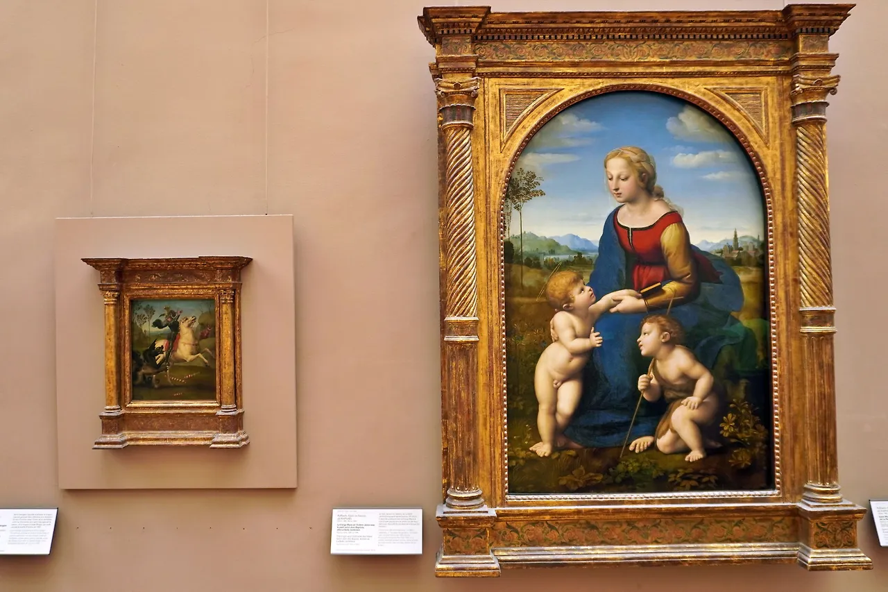 많은 후대 화가가 라파엘로의 구도를 일종의 교본으로 삼고 따라 했을 정도로, 라파엘로의 구도 잡기는 가장 안정적이고 완벽하다는 평가를 받았습니다. 루브르에는 없지만, 라파엘로는 <요정 갈라테아>나 <아테네 학당>처럼 여러 인물이 등장하는 큰 크기의 그림도 많이 그렸는데요. 라파엘로의 구도를 잡는 실력 덕분에 그런 그림들 역시 많은 인물이 등장함에도 어지럽지 않고, 안정적인 인상을 줄 수 있죠. 결국 라파엘로는 다빈치와 미켈란젤로가 남긴 사실적인 표현 방식에 우아함을 더하고, 안정적인 구도로 그림을 완성했기 때문에 우리는 라파엘로의 그림을 보면 마음이 편안해지는 것이고, 당시 이탈리아의 귀족들이 너도나도 라파엘로의 성모자 그림을 원했던 겁니다.