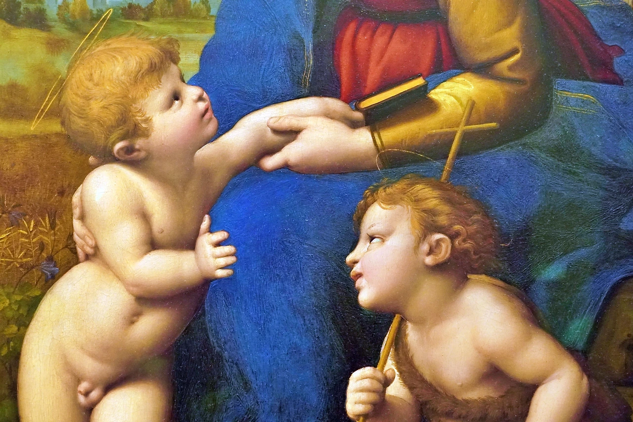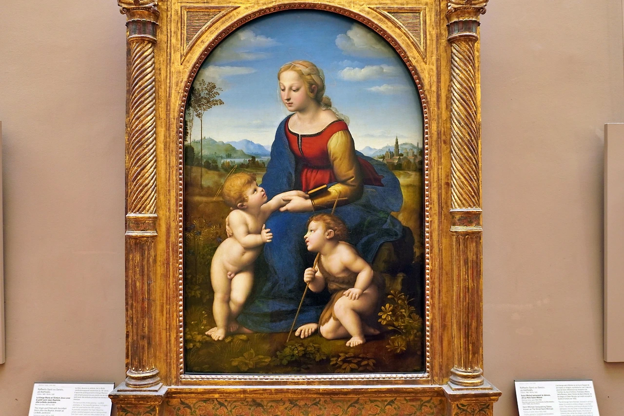 그의 온화한 인품은 그림에 그대로 묻어납니다. 라파엘로는 성모자 그림을 많이 남겼습니다. 아기 예수와 성모 마리아가 함께 있는, 여기에 세례자 요한이나 성모 마리아의 어머니인 성 안나가 등장하는, 나름의 패턴 있는 그림이었습니다. 당시 이탈리아의 부자들은 저마다 기도할 때 볼 수 있는 성모자 그림을 하나씩 갖고 싶어 했습니다. 그중에서도 성모자 그림을 가장 잘 그리는 라파엘로의 그림을 갖고 싶어 했죠. 저는 라파엘로가 남긴 여러 개의 성모자 그림 중 최고는 루브르에 있는 ‘아름다운 정원사’란 별칭을 가진 <세례 요한과 함께 있는 성모와 아기 예수>라고 생각합니다.