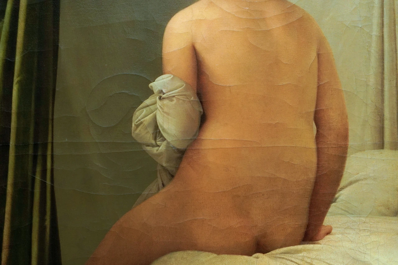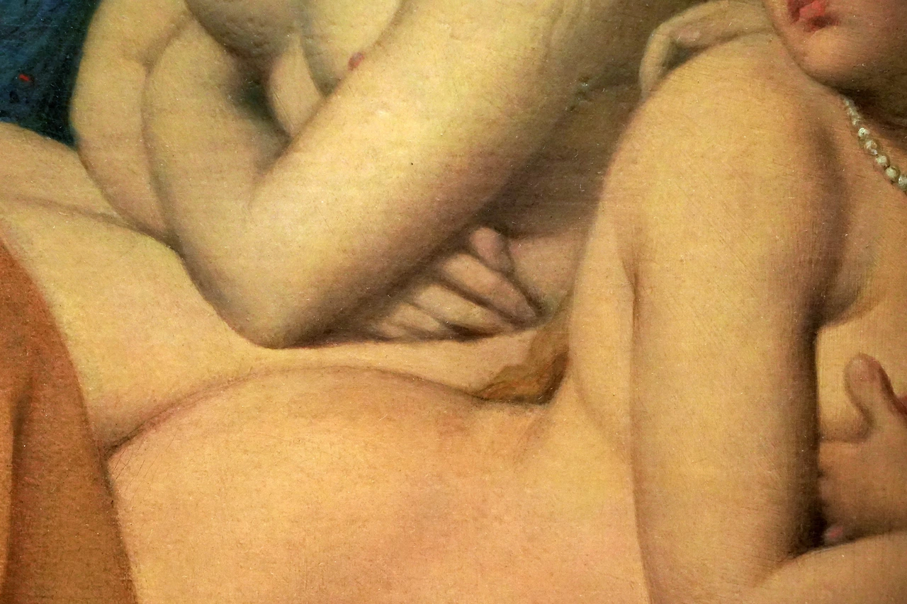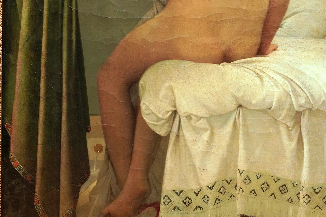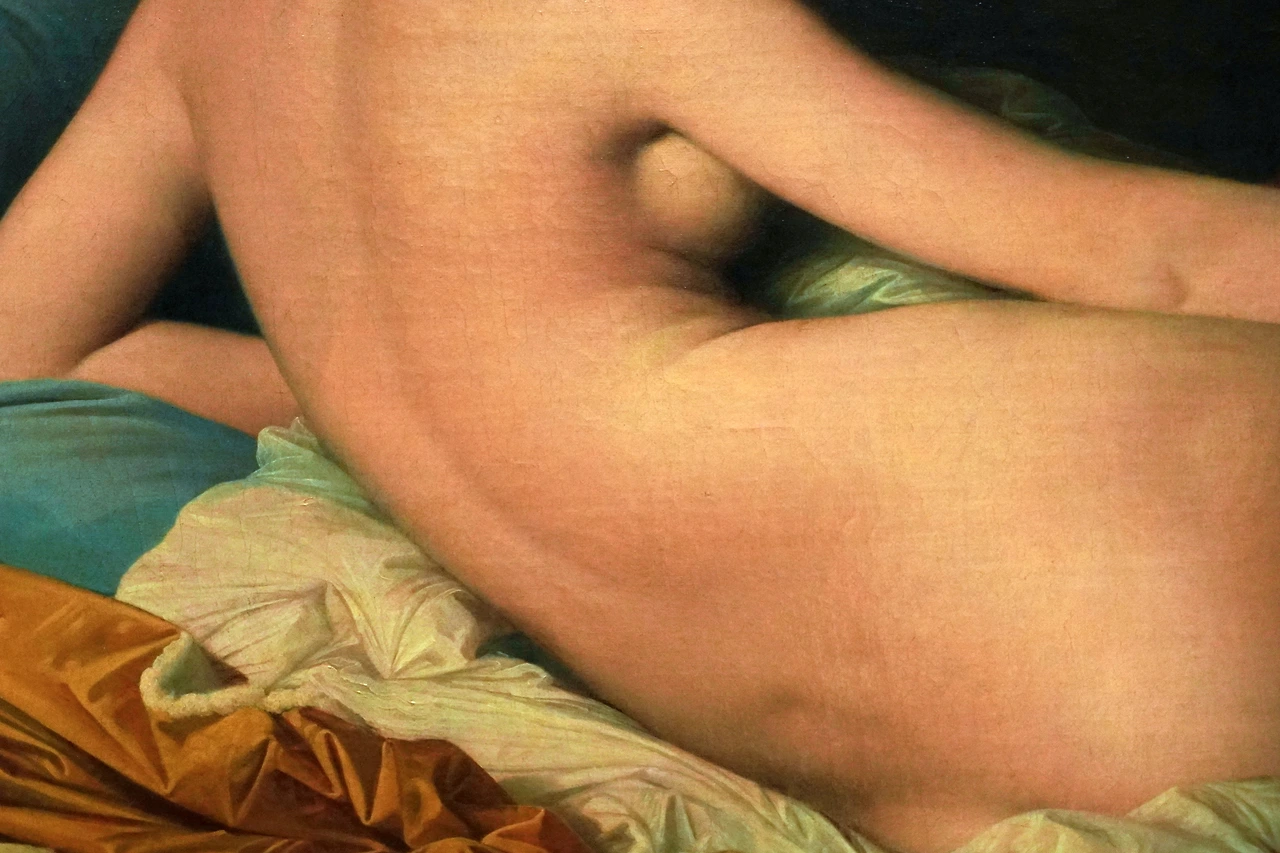 앵그르가 여러 번 수정하며 애착을 보인 그림인데, 그가 처음 이 그림을 프랑스 선생님들에게 보여줬을 때 혹독한 평가를 받게 됩니다. 인체 비례가 엉망이란 이유에서였죠. 여성의 하체가 너무 부실해 저 여성이 실제 일어난다면, 자기 상체를 지탱하지 못할 것이라는 비판을 받았습니다. 그림을 잘 보면 이는 아주 정확한 지적입니다.