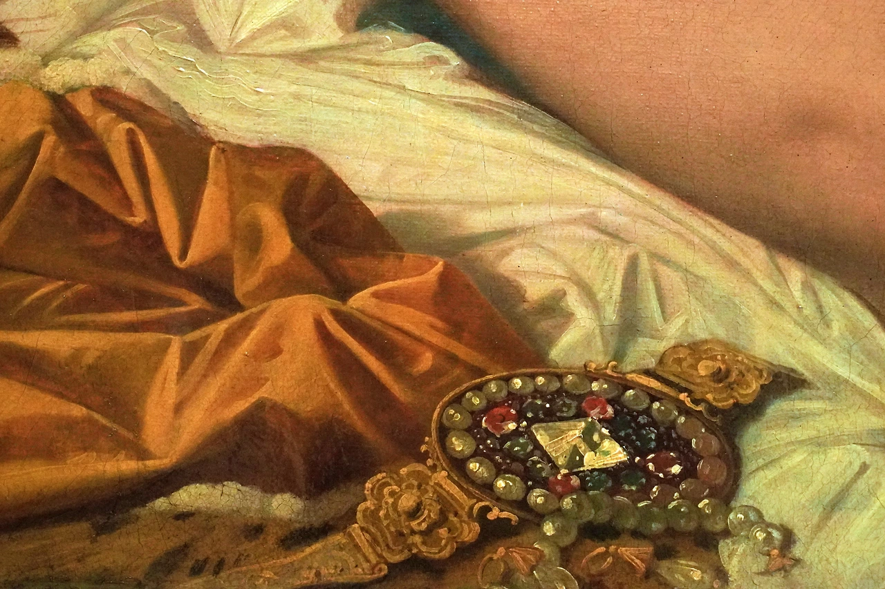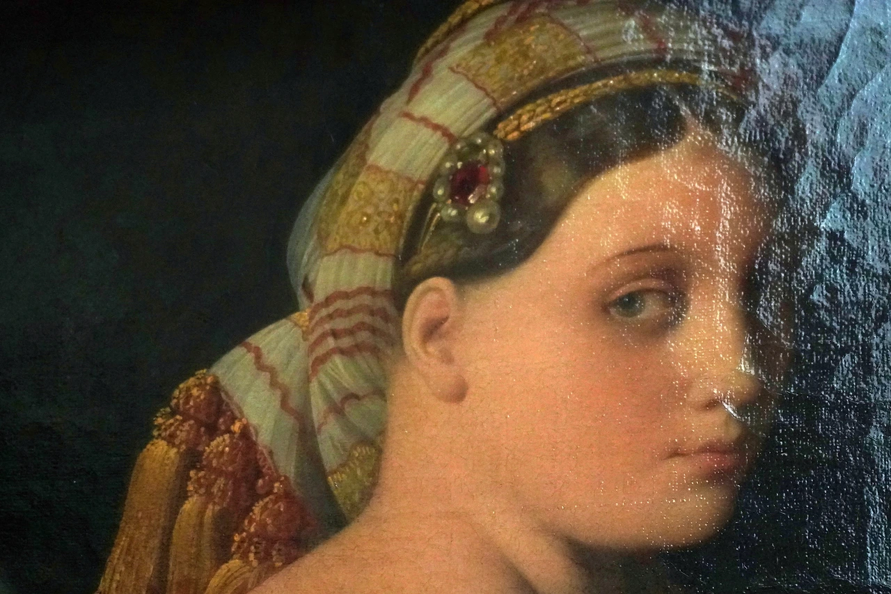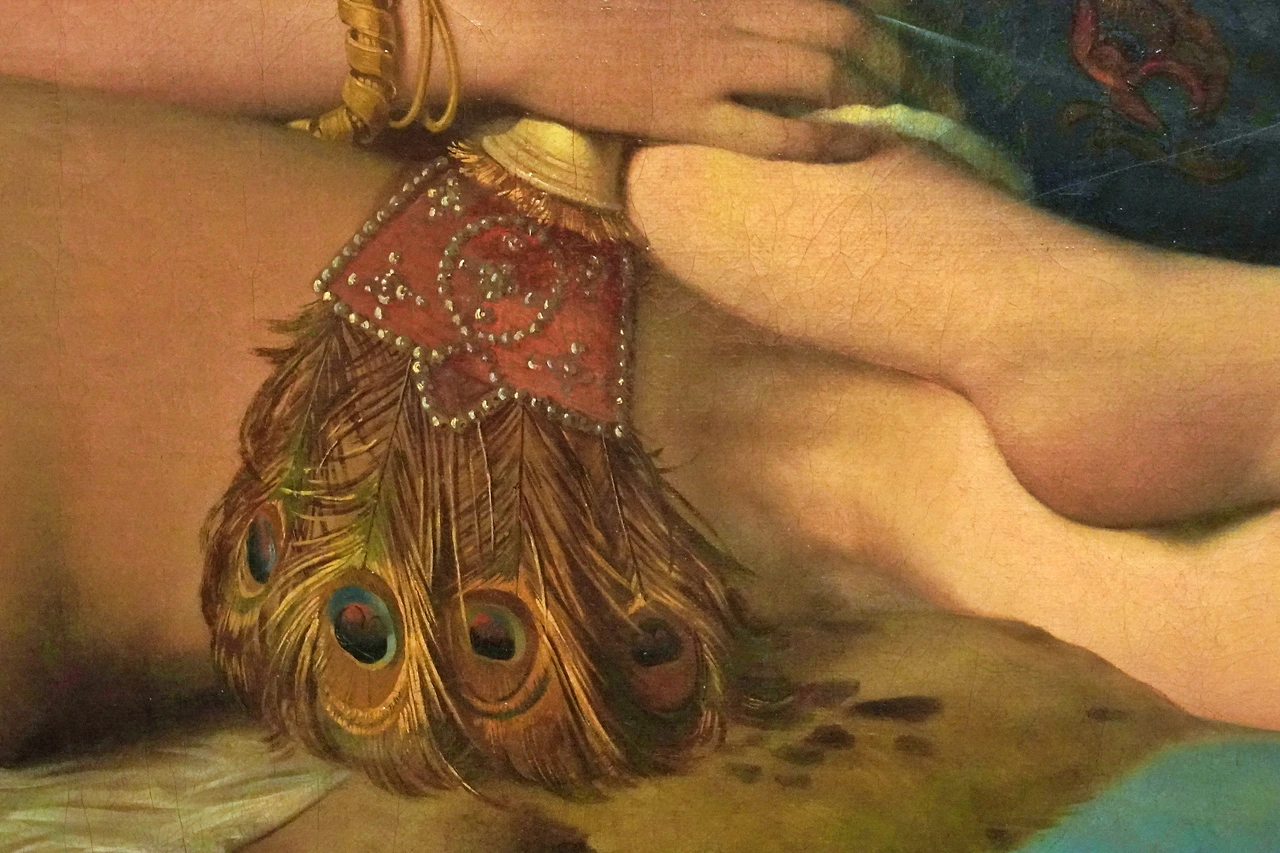 딱 봐도 머리에 쓰고 있는 두건이나 들고 있는 부채 등이 유럽 왕실의 스타일이 아닙니다. 자세히 보면 마치 다비드가 <황제의 대관식>에서 황후 조세핀의 망토 재질을 정확히 표현했던 것처럼, 앵그르 역시 오달리스크가 들고 있는 부채나 이불의 재질, 이국적인 장식품을 사실적으로 표현했습니다.