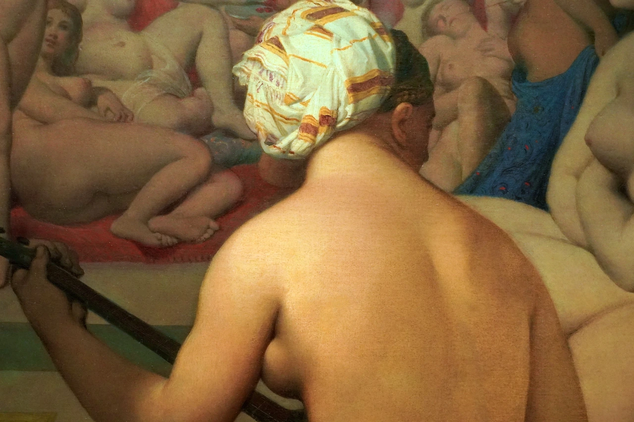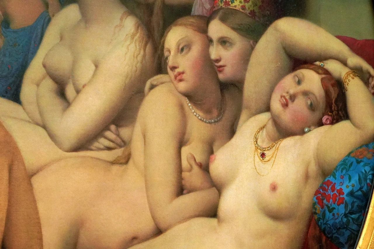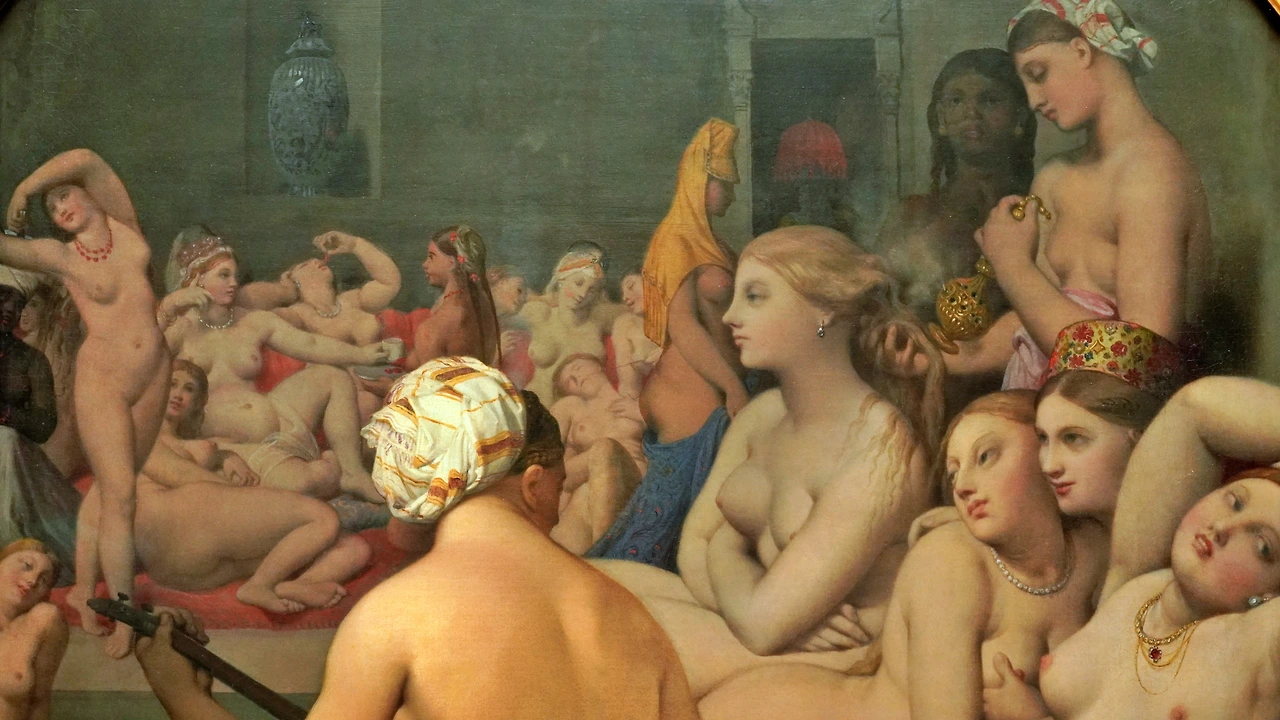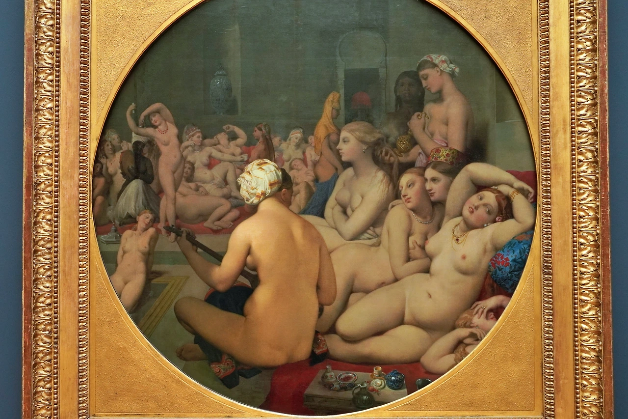 당시 프랑스의 한 귀족 부인이 터키에서 목욕탕 간 경험을 기록으로 남겼는데, 그 기록을 보고 80세가 넘은 거장 앵그르가 에로틱 정점을 완성해 냈습니다. 오리엔트의 여성 한두 명이 보일 듯 말 듯 한 시스루 의상을 입고만 있어도 자극적인데, 여성 여러 명이 나체로 모여있는 공간을 그렸으니, 당시로서는 얼마나 야했겠습니까.