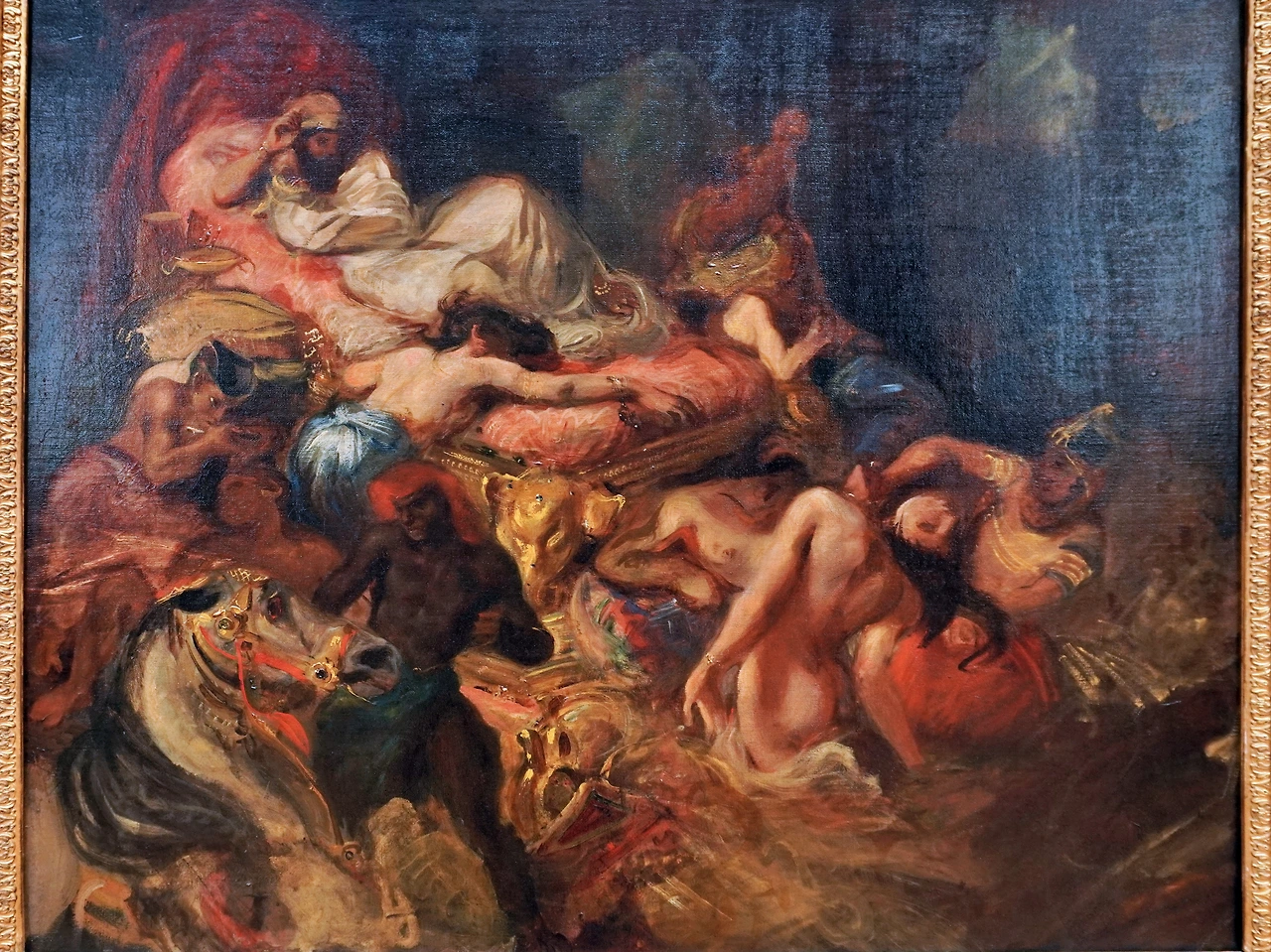 오리엔트와 바이런에 빠져있던 들라크루아가 바이런의 비극 ‘사르다나팔루스’를 읽고 얼마나 흥분했겠습니까. (물론 기원전 7세기의 이야기니 사르다나팔루스에 대한 기록도 없거니와, 바이런의 상상력이 듬뿍 담긴 작품에 들라크루아의 스토리-자신의 후궁을 살해하고 이를 응시하는 왕-까지 담겼으니, 이 그림은 픽션이라고 보는 게 맞을 겁니다.)