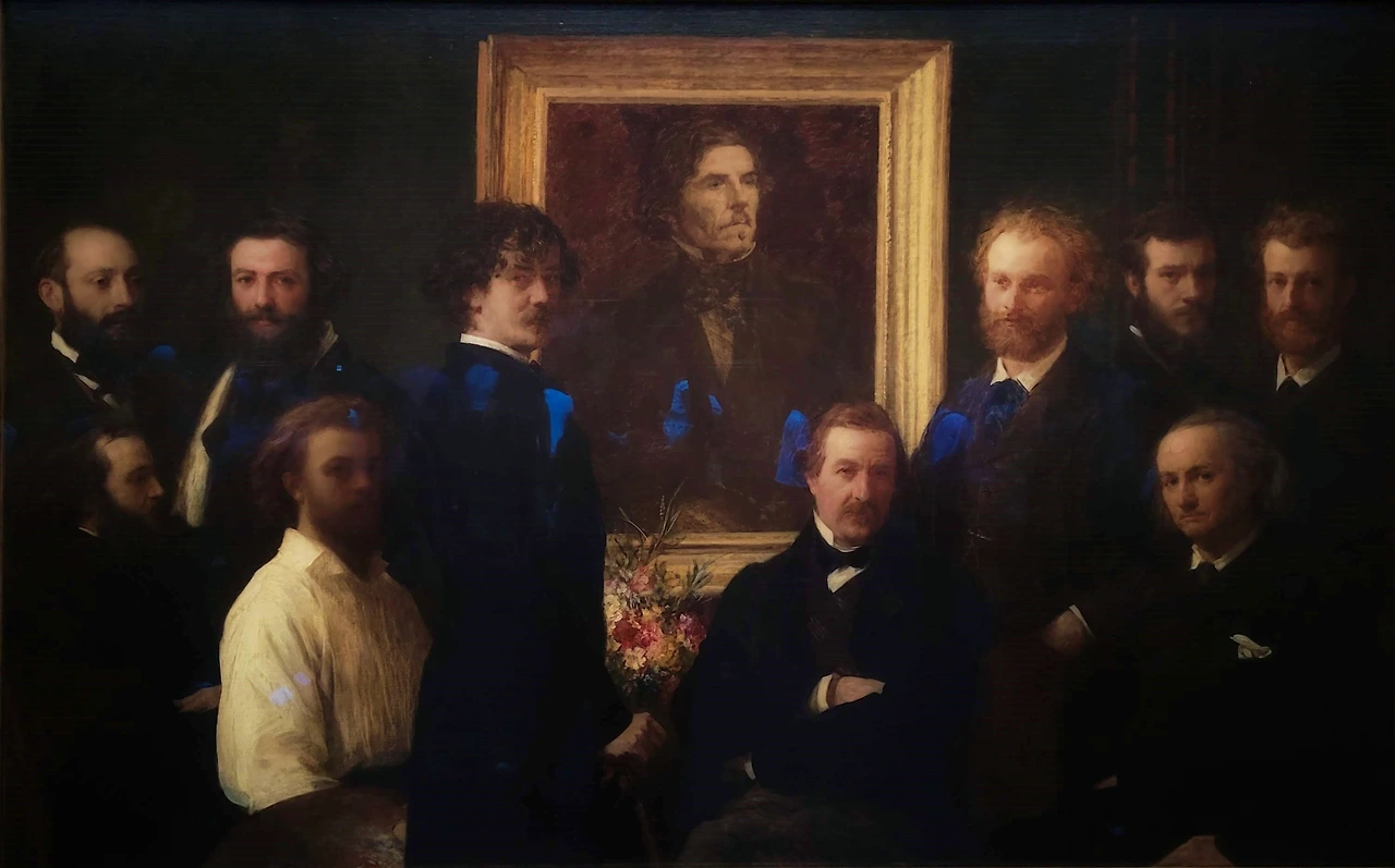 들라크루아에게 바치는 경배, 액자 오른쪽 옆의 수염난 백인이 마네.
