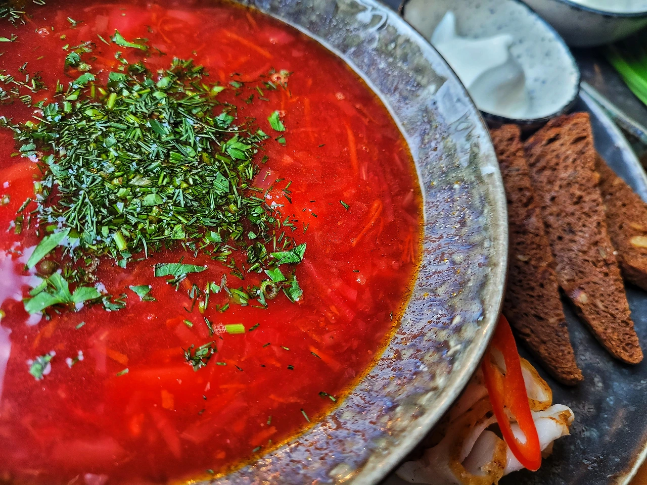 보르쉬. 보기엔 아주 얼큰한 매운탕처럼 생겼지만 전혀 맵지 않은, 색깔만 붉은 고기국이다. 여기에 요구르트를 넣어 먹는데 전혀 어색하지 않은 맛이다. 검정빵과 러시아식 돼지비계가 같이 나온다. 그래도 수프 속 야채와 고기를 함께 먹으니 어설프게 나미 육개장 먹는 느낌이 난다. 물론 매운맛이 있다면 더 좋았겠지만. 지난번 여름에 왔을 땐 차가운 보르쉬를 먹었었다. 이렇게나 자주 키이우에 오게 될 줄 몰랐지만, 그래도 이젠 보르쉬를 먹으면, 그래 이 맛이야 정도의 감탄사는 내뱉을 수 있게 됐다.