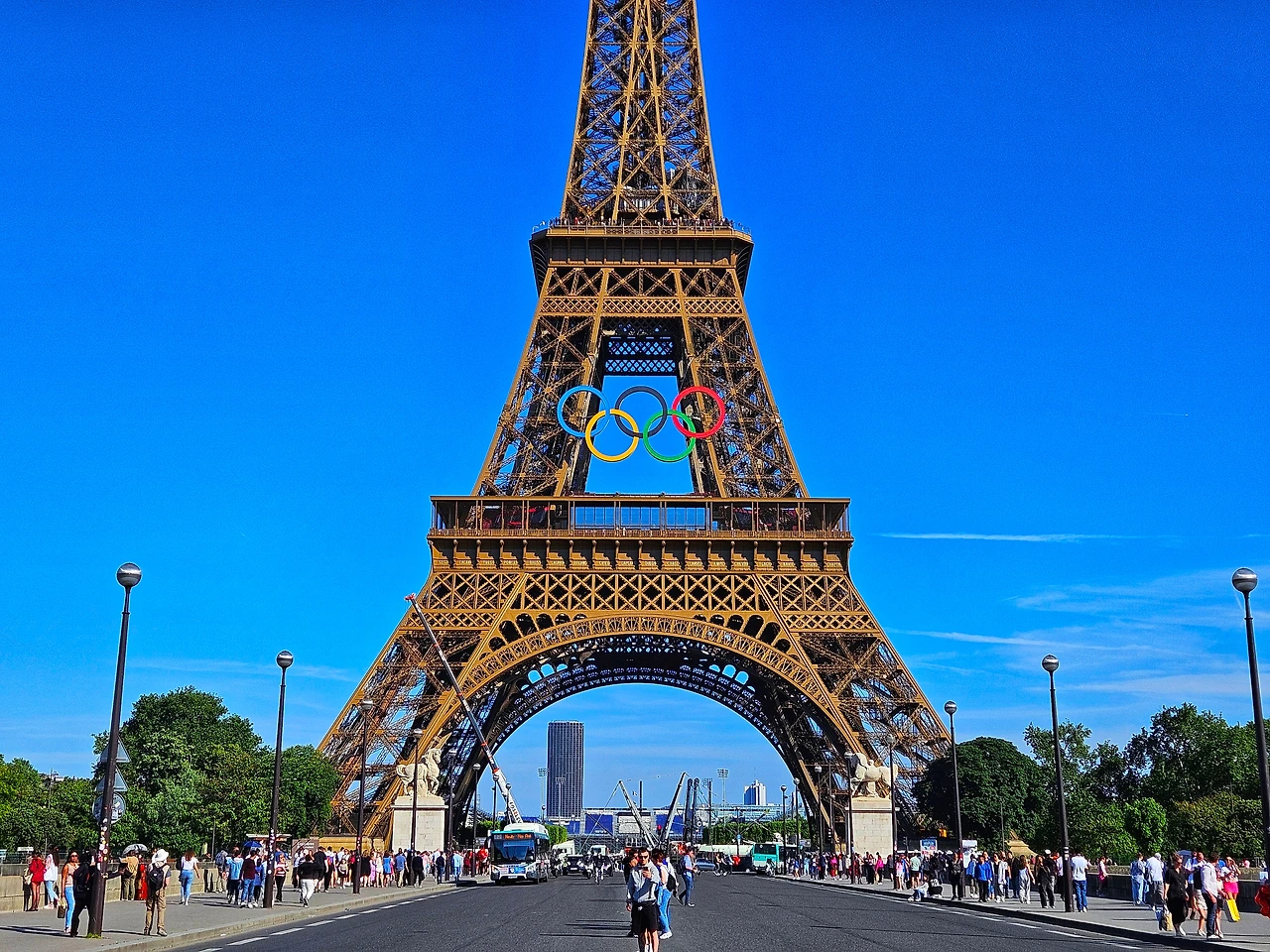 에펠탑의 오륜기 설치 완료. 올림픽 준비 끝