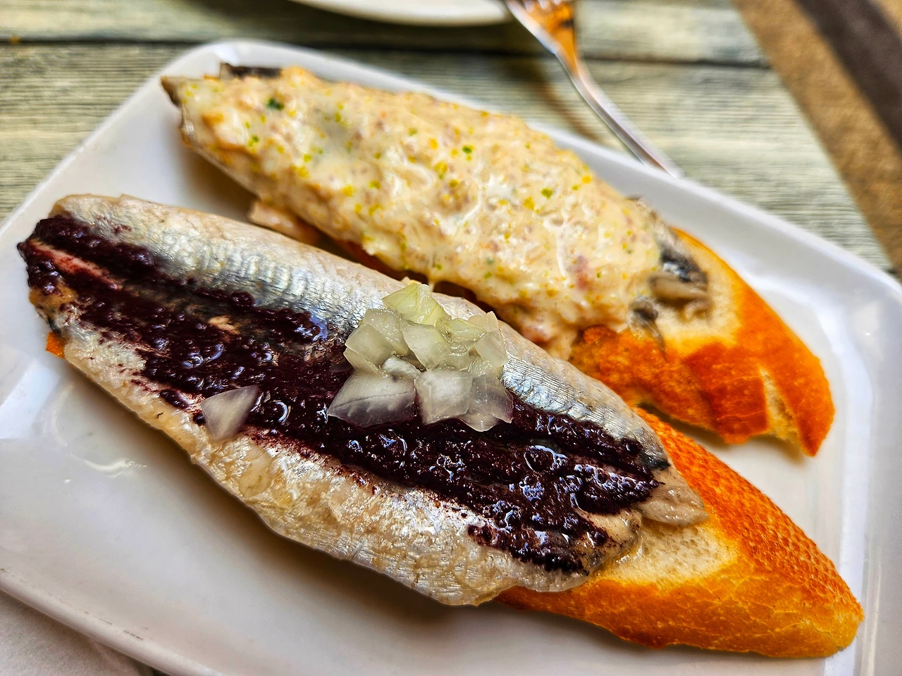 맛 없어 보이는 길다와 검은 올리브유를 뿌린 안초비 타파스