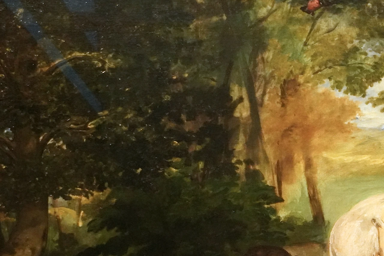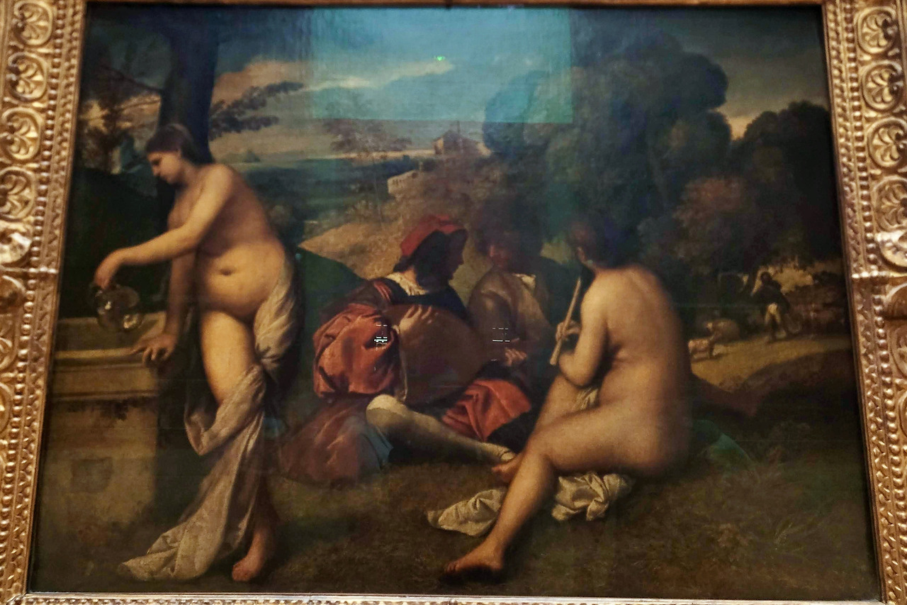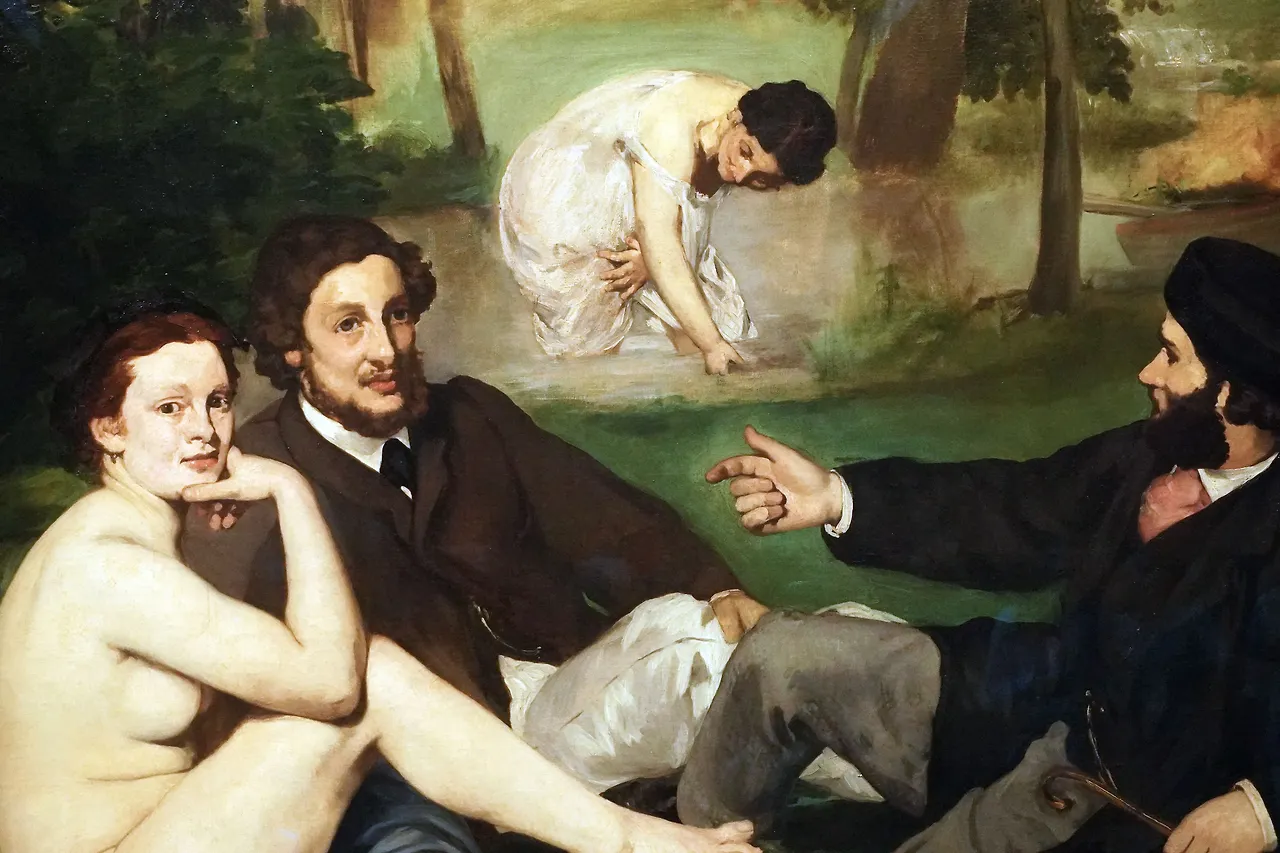 옷을 입은 두 명의 남성이 벌거벗은 여성과 숲에서 점심을 먹고 있습니다. 뒤에는 속옷 차림의 또 다른 여성이 연못에서 몸을 씻고 있죠. 벗은 옷가지, 음식, 바구니 등이 바닥에 떨어져 있습니다. 쿠르베 Gustave Courbet의 ‘세상의 기원’은 지금 봐도 파격적인 작품이지만, ‘풀밭 위의 점심’은 평범해도 너무나 평범합니다. 마네는 사실 소재를 찾는 실력은 조금 부족했던 것 같습니다. 그래서 그는 루브르 박물관에서 이탈리아, 스페인 그림을 자주 모사했고, 때론 과거 그림에서 영감을 받아 작업을 시작하는 예도 많았습니다. ‘풀밭 위의 점심’도 마찬가지였습니다. 루브르 박물관이 소장 중인 이탈리아 화가 티치아노 Tiziano Vecellio의 ‘전원 음악회’Le Concert Champêtre의 설정, ‘두 명의 누드 여성과 옷 입은 남성이 전원에서 즐겁게 보낸다는 상황을 마네가 빌린 거죠.